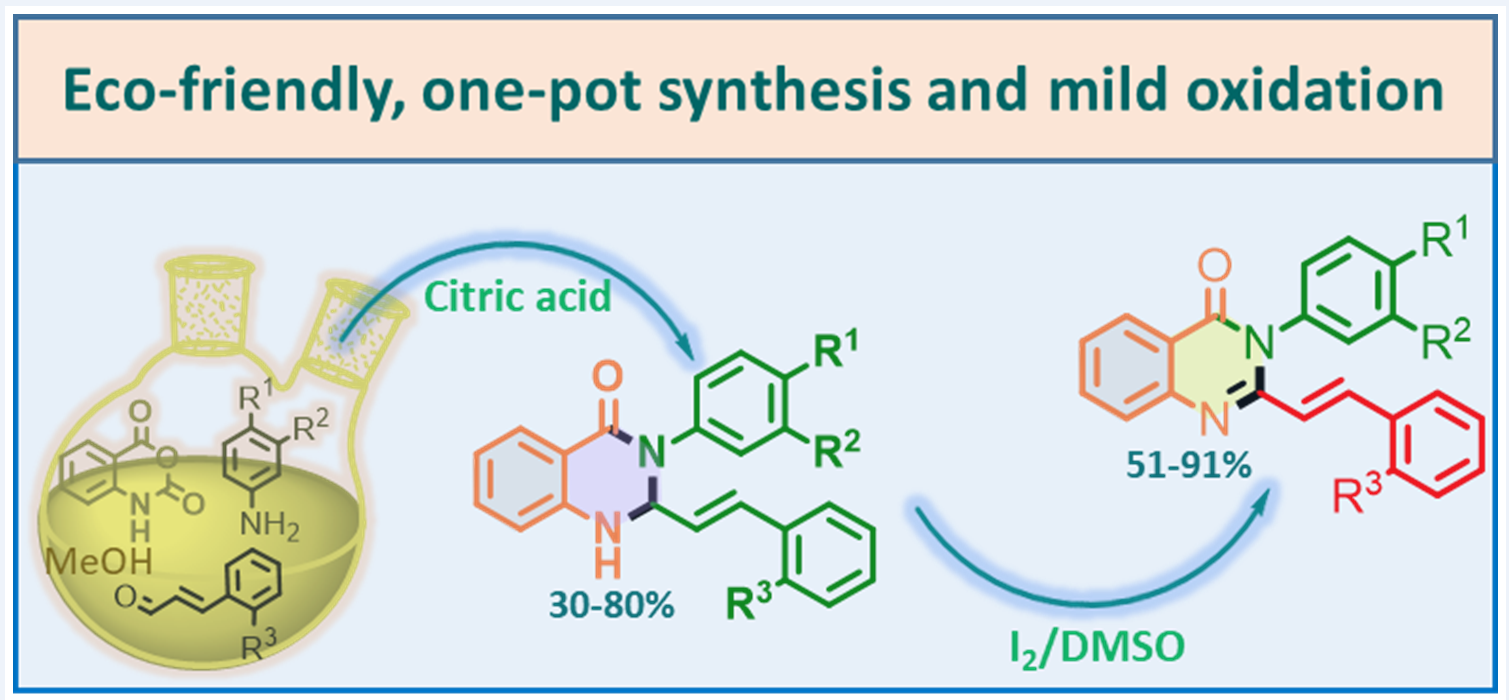 We hereby report a simple and efficient method for the preparation of (E)-3-aryl-2-styryl-2,3-dihydroquinazolin-4-(1H)-ones, from isatoic anhydride, anilines and cin-namaldehydes in the presence of 20 mol% citric acid in methanol at 60 °C for 2 h. The styryl-dihydroquinazolin-4-(1H)-one products were obtained in moderate and good yields (30-80 %) through the three-component condensation reaction, under an environment-friendly protocol. The latter were easily transformed into styrylquinazolin-4-(3H)-one derivatives with 57-91 % yields using a mild oxidation with I2/DMSO system for less than 60 min.