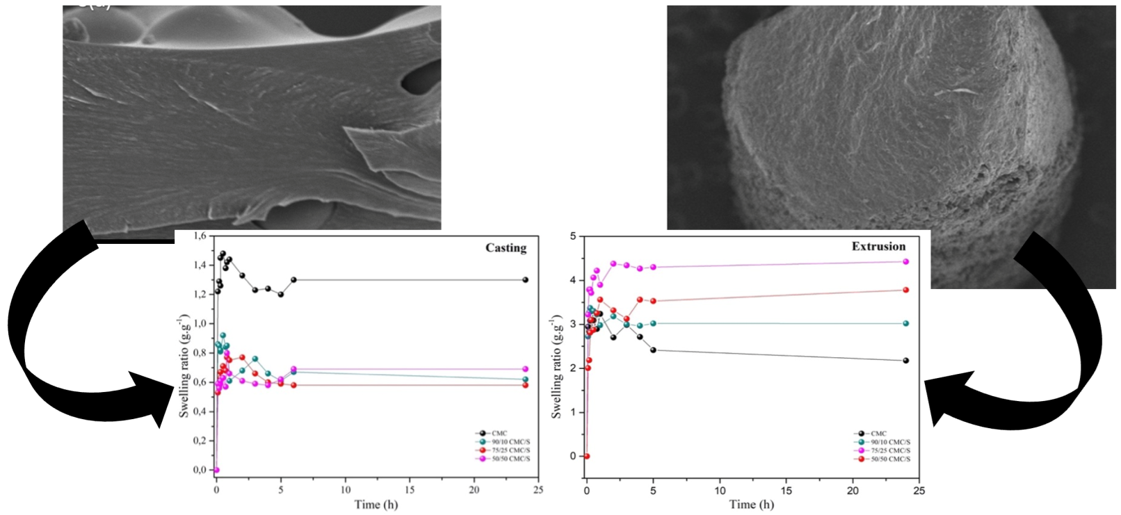 This study discusses the preparation of biopolymeric hydrogels (Biomaterial) via different techniques, such as casting and extrusion, to compare the effects of the process and the use of citric acid as a crosslinker on hydrogel morphology, physicochemical properties, and swelling degree. Casting is widely used for its low cost and space-saving nature, but up-scaling is problematic. Extrusion offers a way to produce materials in large quantities; these materials can undergo mechanical and thermal energy, which can significantly alter their properties. The samples obtained by extrusion had porous surfaces, which are critical for water penetration and swelling of superabsorbent hydrogels. In contrast, the hydrogels produced by casting did not form pores, resulting in a lower degree of swelling. Extrusion increased the swelling degree threefold due to the formation of pores, influencing water absorption and diffusion dynamics, especially in samples with higher starch content, where crosslinking occurred more effectively.