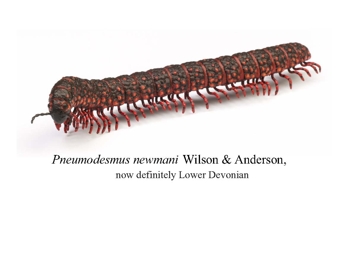 The oldest recorded air-breathing land animal, the millipede, Pneumodesmus newmani Wilson & Anderson, 2004, is enormously significant in the understanding of the evolution of the earliest terrestrial ecosystems (Wilson and Anderson, 2004; Brookfield, 2020; Buatois et al., 2022; Wellman et al., 2023). The single specimen was found by Mike Newman in 2001 in the Cowie Harbour Fish Bed (or Dictyocaris bed as fish are scarce), just east of Cowie, Aberdeenshire, Scotland. The age of this Fish bed is controversial. Using the current Silurian and Devonian time scales of Melchin et al (2020) and Becker et al. (2020), the Fish Bed was initially estimated as Downtonian (latest Silurian, Pridoli) based on the fish fauna (Westoll, 1951). Floral evidence from isolated inland exposures later pointed to a late Wenlock- early Ludlow (mid-Silurian) age (Marshall, 1991; Wellman, 1993). LA-ICP-MS U/Pb youngest single grain detrital zircon dates of 414.3±7.1 and 413.7±4.1(2σ) Ma, from strata bounding the fish bed, re-established the Pridoli/Lochkovian (latest Silurian-early Devonian) age (Suarez et al., 2017); but was followed by a return to a Wenlockian age again, based on further floral evidence and a youngest detrital zircon LA-ICP-MS U-Pb date of 430 ± 6 (1σ) Ma from adjacent, but fault-separated, exposures (Wellman et al., 2023).