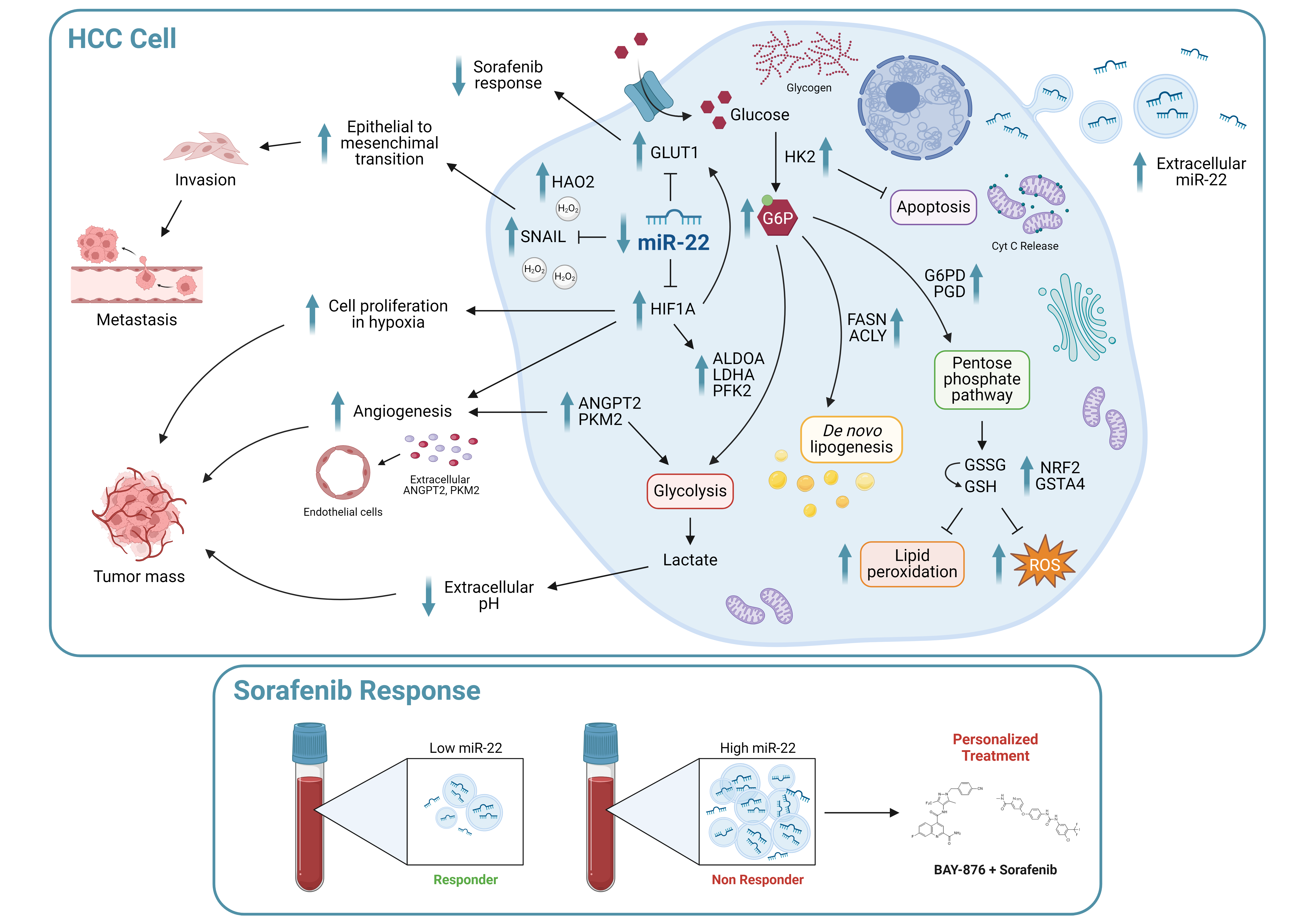 23], associated with the onset of drug resistance, paving the way for the development of combined treatments based on metabolic inhibitors. Here, we investigated the role of the miR-22/GLUT1 axis in hepatocarcinogenesis, glycolytic shift, and sorafenib resistance, and evaluated miR-22 as a circulating biomarker of sorafenib response in HCC.