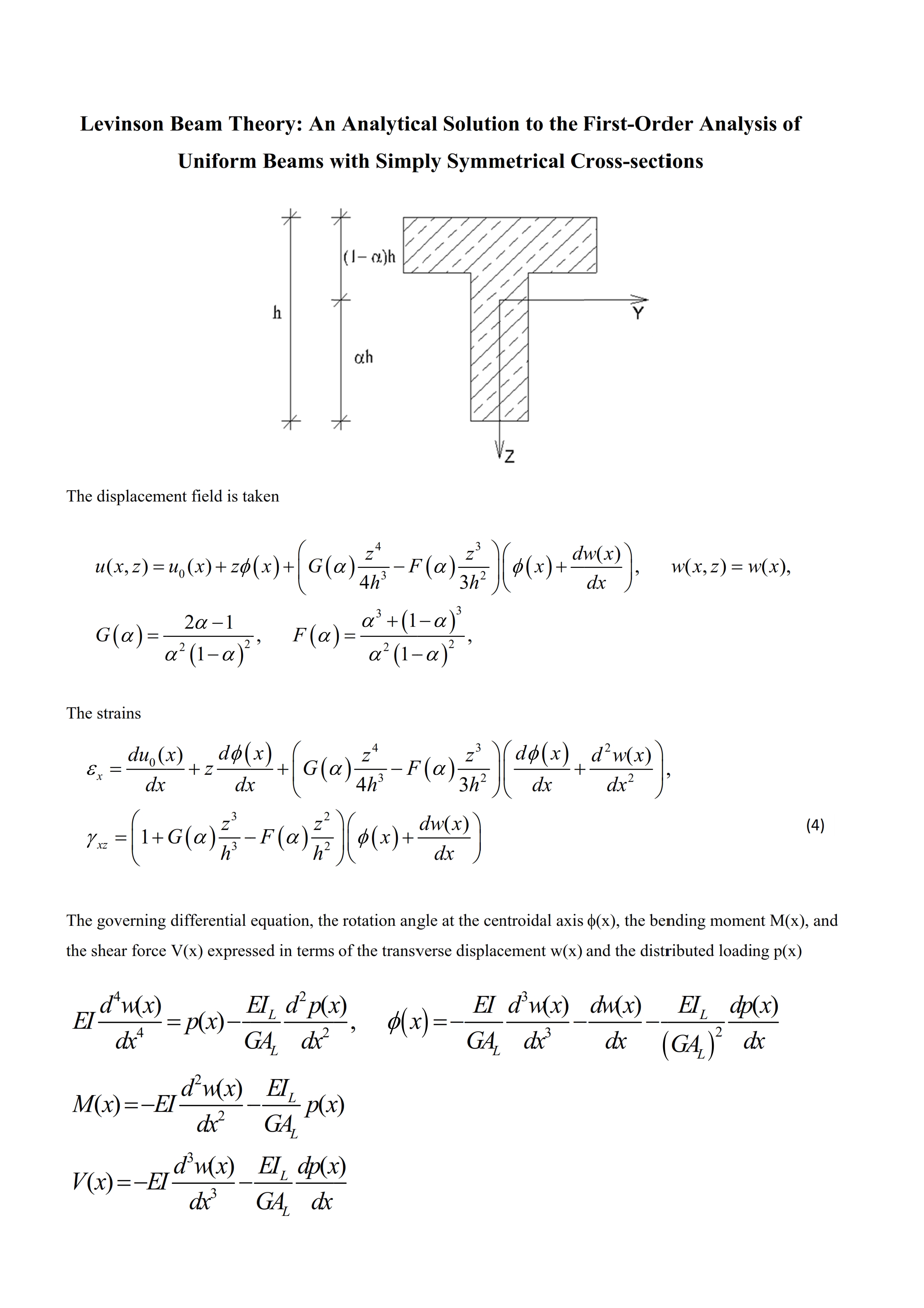 0(x) is the displacement of the centroidal axis and φ(x) is the counterclockwise positive rotation of the cross-section at the centroidal axis. It is noted that for beams with double symmetrical cross sections α = 0.5 and the coefficients G(α) = 0, F(α) = 4, and so Equation (3) corresponds to the Levinson [