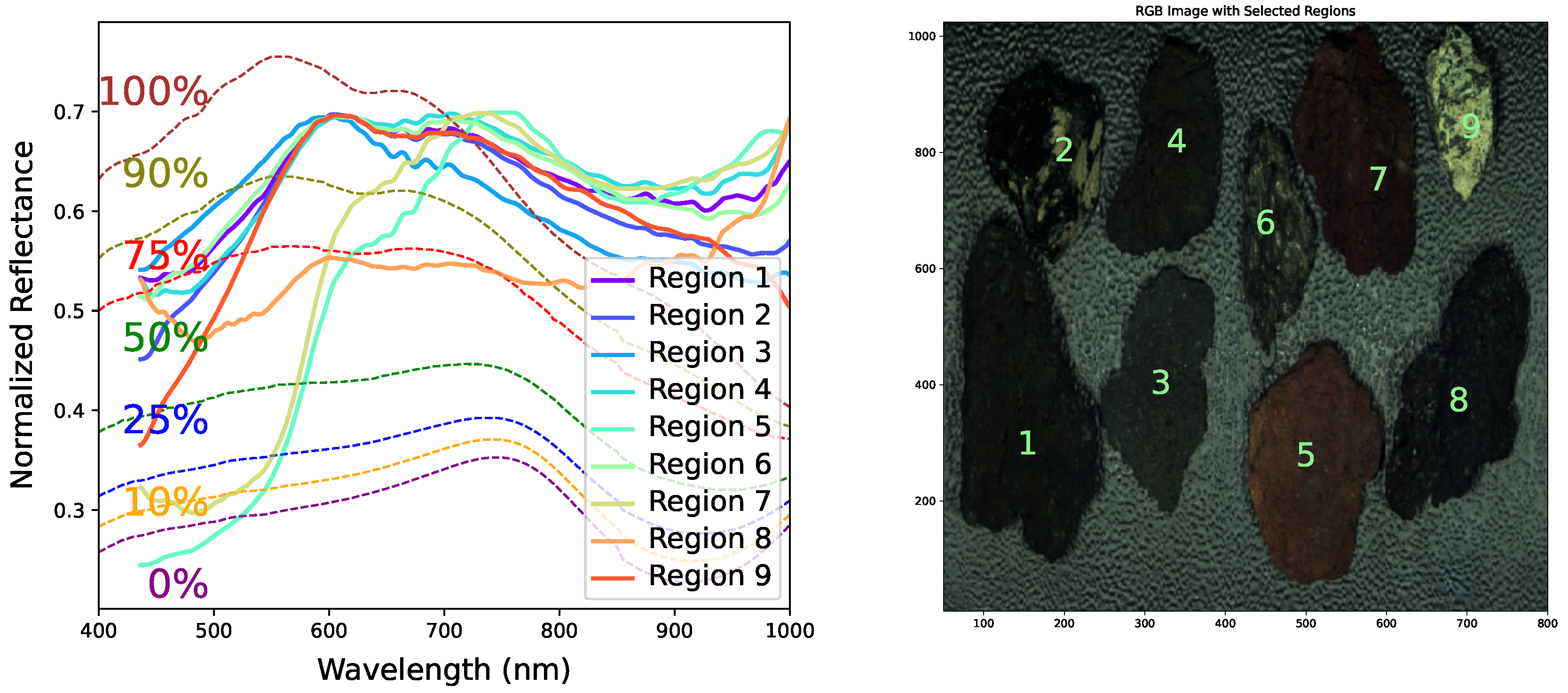 Figure 2 presents a hyperspectral image (400-1000 nm) of volcanic samples from Vulcano, a volcanically active island in the Aeolian Archipelago, north of Sicily, Italy, illustrating the effectiveness of hyperspectral imaging in revealing detailed mineral compositions. The RGB color images utilize typical ranges of R: 650 nm, G: 550 nm, and B: 450 nm to approximate true-color visualization, in line with standard practices, highlighting the extracted regions of interest (ROIs). The extracted regions samples of interest (ROIs) are highlighted by green numbers overlaid on the image, with detailed spectral analysis presented in the left panel. Nine samples, marked by green numbers, were selected for an in-depth spectral analysis of pyroxene and olivine compositions. The left panel of the figure shows the median spectra for the selected regions depicted in the right panel. Notably, at least 80% of the volcanic samples align with the median spectra for pyroxene and olivine, suggesting that these minerals should ideally be present in all samples, except for Regions 5 and 7, which require further analysis. The database template for pyroxene and olivine, as reported by [