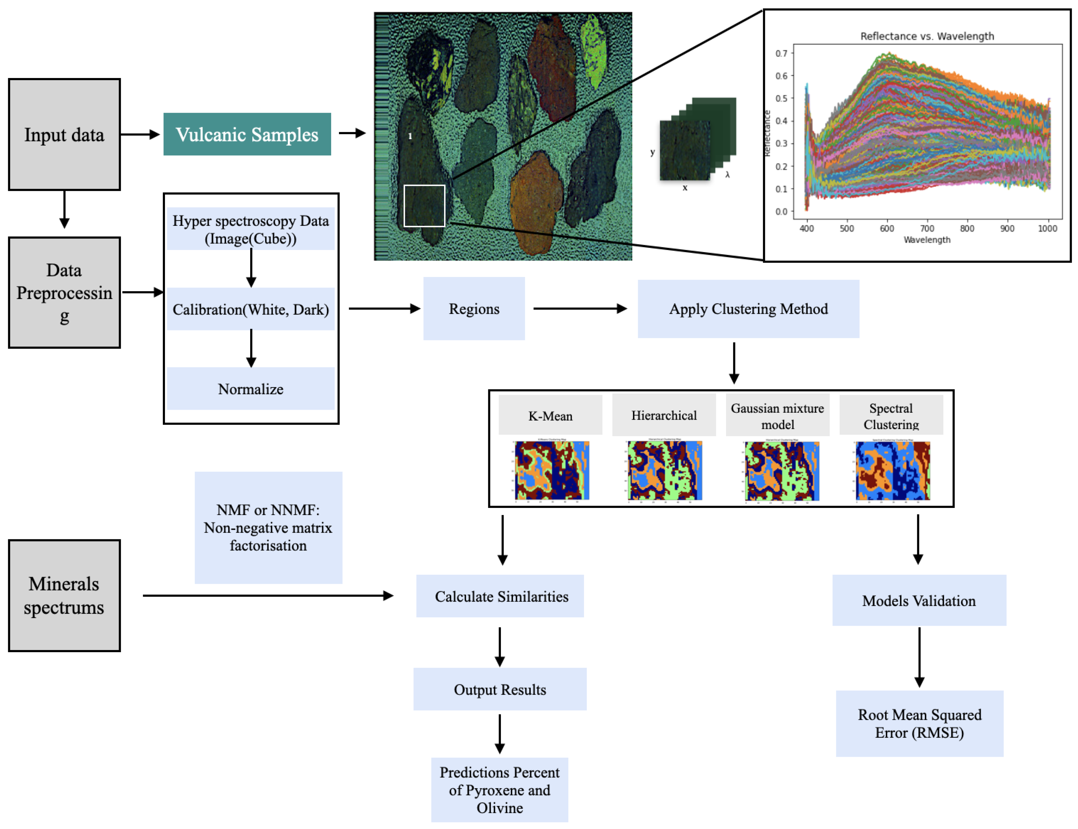 Hyperspectral data analysis pipeline for volcanic samples. This figure illustrates the systematic approach used to process and analyze hyperspectral images, including calibration, normalization, and the application of various clustering algorithms. The pipeline ultimately predicts the mineral composition, specifically focusing on pyroxene and olivine, enhancing our understanding of volcanic material characteristics.