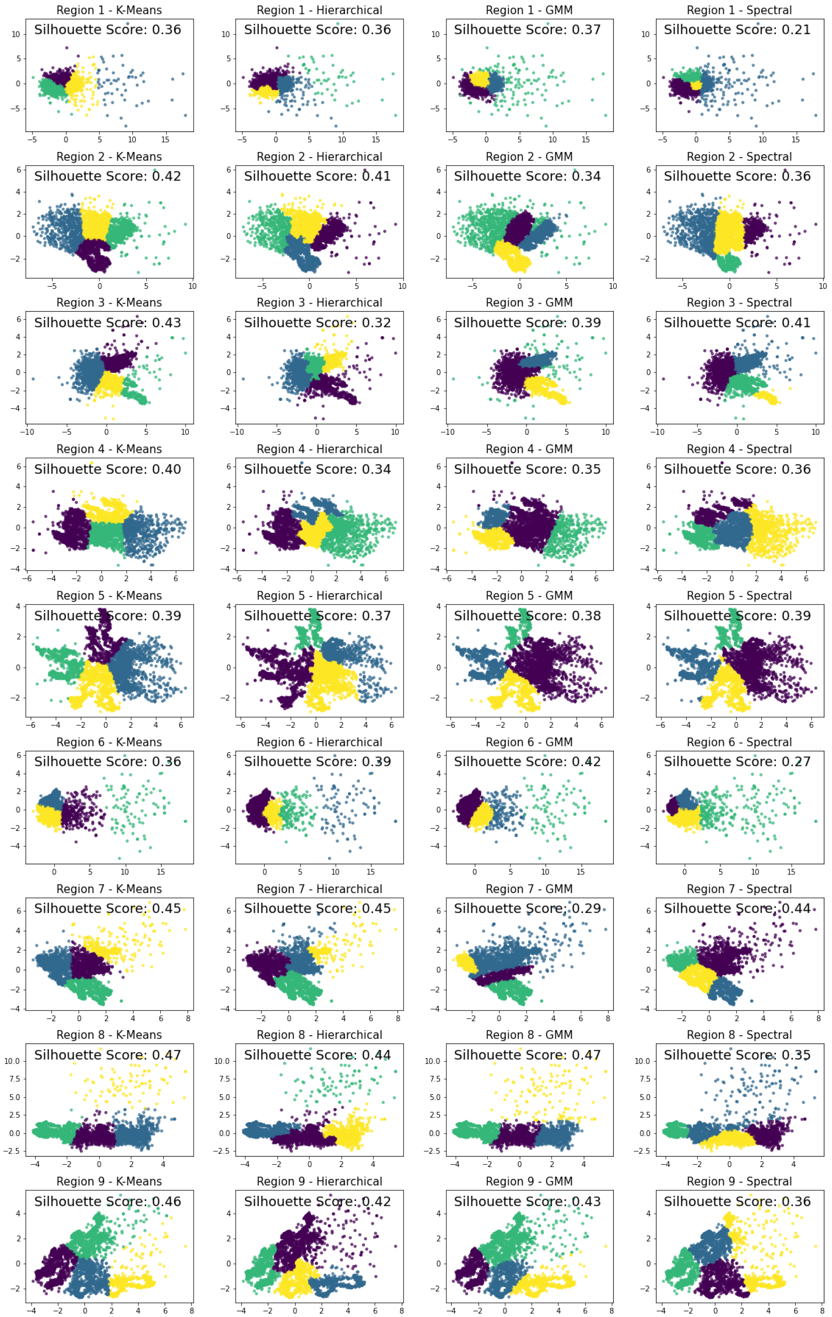 Figure 4. The clustering algorithms assessed included K-Means, Hierarchical Clustering, Gaussian Mixture Model (GMM), and Spectral Clustering. The performance of these algorithms varied across different regions, as indicated by silhouette scores ranging from 0 to 1, with higher scores suggesting better-defined clusters.
