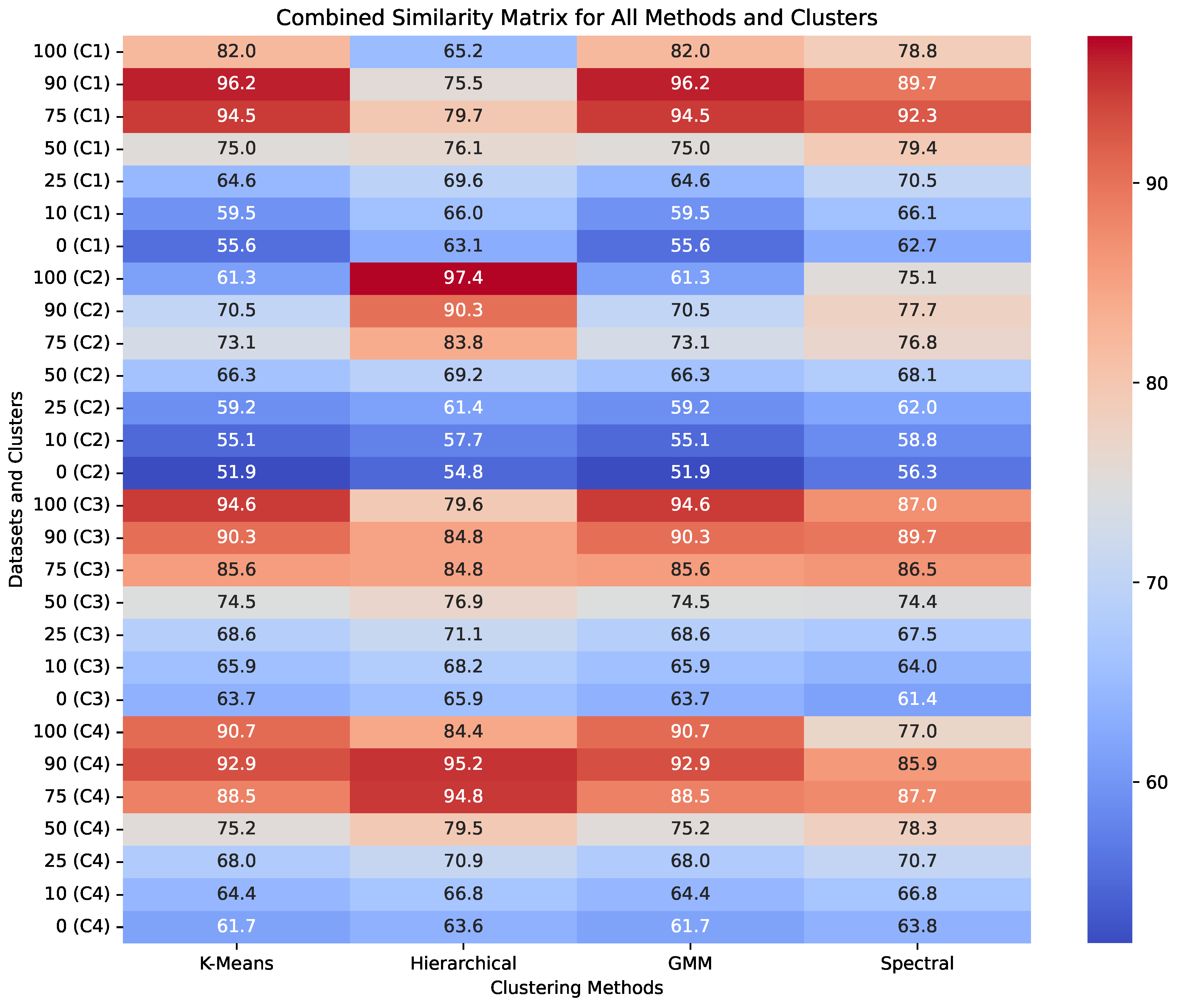 Comparative analysis of mineral composition (the percentage of olivine (100%-Pyroxene)) similarity across clustering models using NMF. This heatmap illustrates the effectiveness of four clustering algorithms—K-Means, Hierarchical, Gaussian Mixture Model (GMM), and Spectral Clustering—in grouping mineral compositions, specifically Olivine (O) and Pyroxene (P), across different clusters (C1–C4). Each cell represents the similarity percentage for specific mineral mixtures, with color gradients indicating the strength of mineral presence from high (red) to low (blue). The results highlight the unique clustering tendencies of each algorithm.