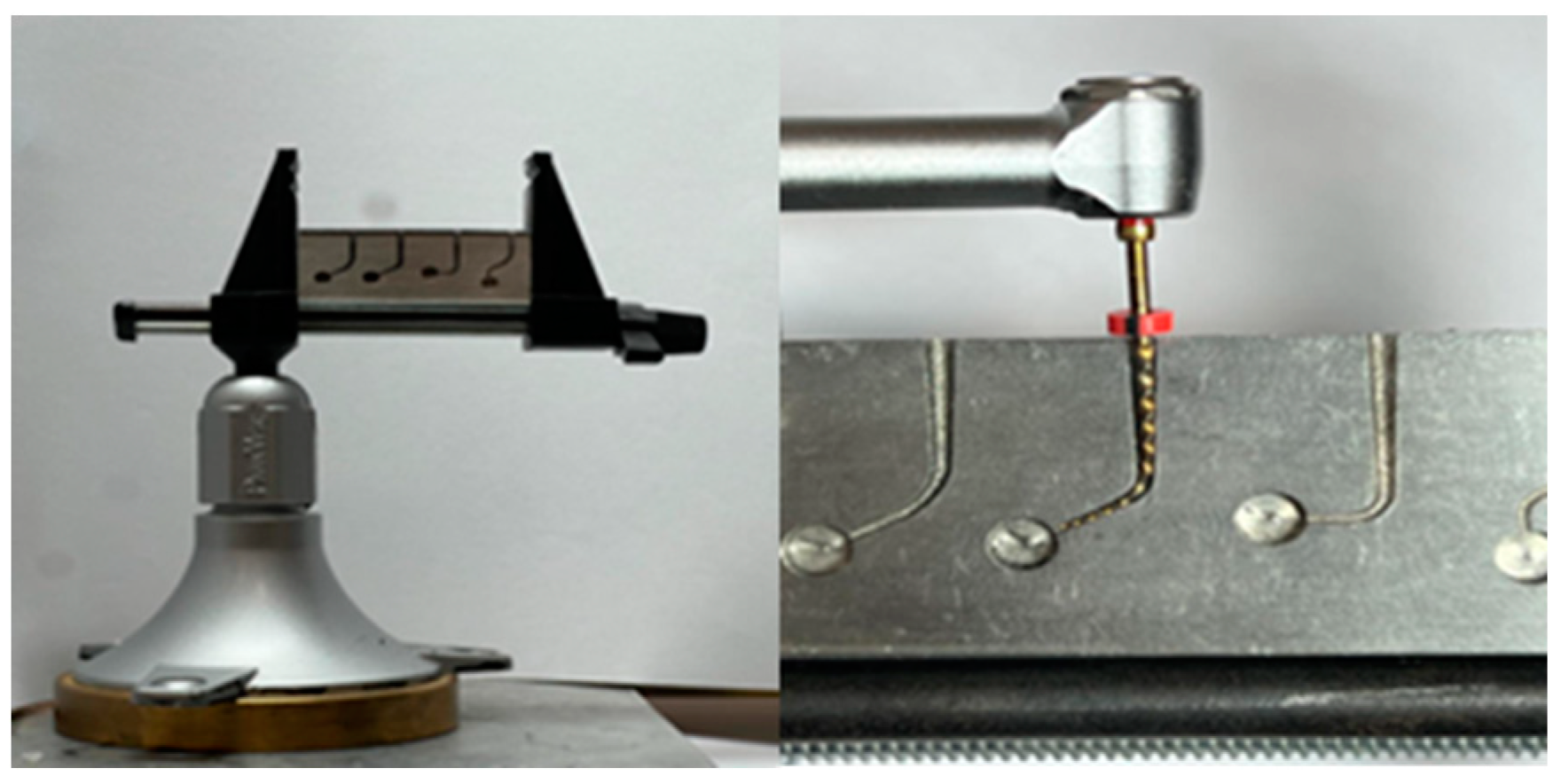 - Elnaghy, A.M.; Elsaka, S.E. Cyclic Fatigue Resistance of One Curve, 2Shape, ProFile Vortex, Vortex Blue, and RaCe Nickel-Titanium Rotary Instruments in Single and Double Curvature Canals. J. Endod. 2018, 44, 1725–1730. [CrossRef]