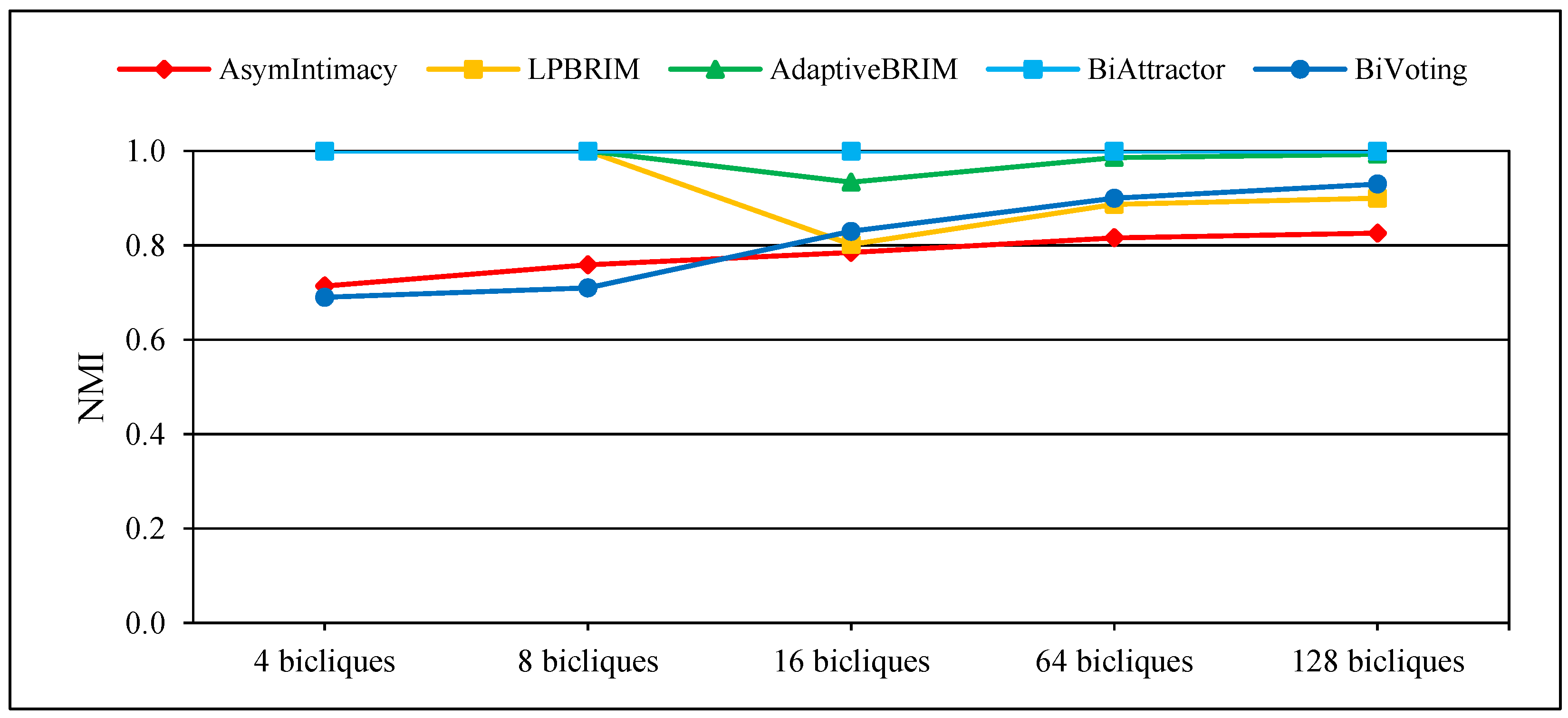 Figure 3, where NMI denotes the degree of accuracy of various bipartite community detection methods and