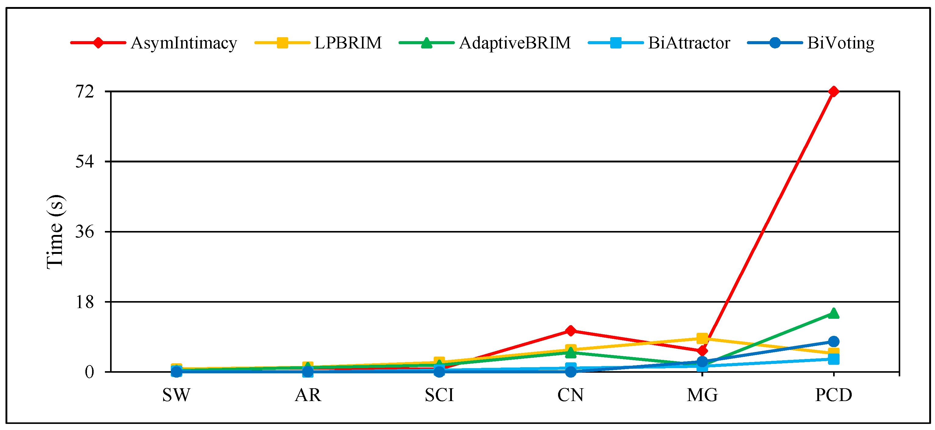 , and the execution time of bipartite community detection methods is represented by