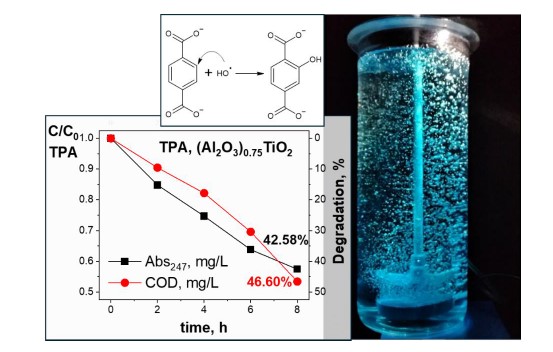 The selection of TPA and PET contaminants was done because TPA is the hydrolysis product of PET, PET can be degraded to TPA and the latter can also be degraded to less toxic contaminants, which represents a challenge for water treatment technology. The reduction of the COD measurement for an initial TPA concentration of 50 mg/L in the reactor with the modified arrangement of stainless-steel discs with the (Al2O3)0.75TiO2 coating and lamps reached 46.60%. This kind of reduction could be associated with the low-scale formation of CO2 from the TPA carboxyl groups. The UV-Vis analysis for 8 h of determination shows the splitting of initial bands those results in the formation of intermediate products. Commercial PET sampling in the presence of the immobilized (Al2O3)0.75TiO2 photocatalyst reduced the COD value to 41% and the UV-Vis analysis revealed degradation efficiency of 37%.
