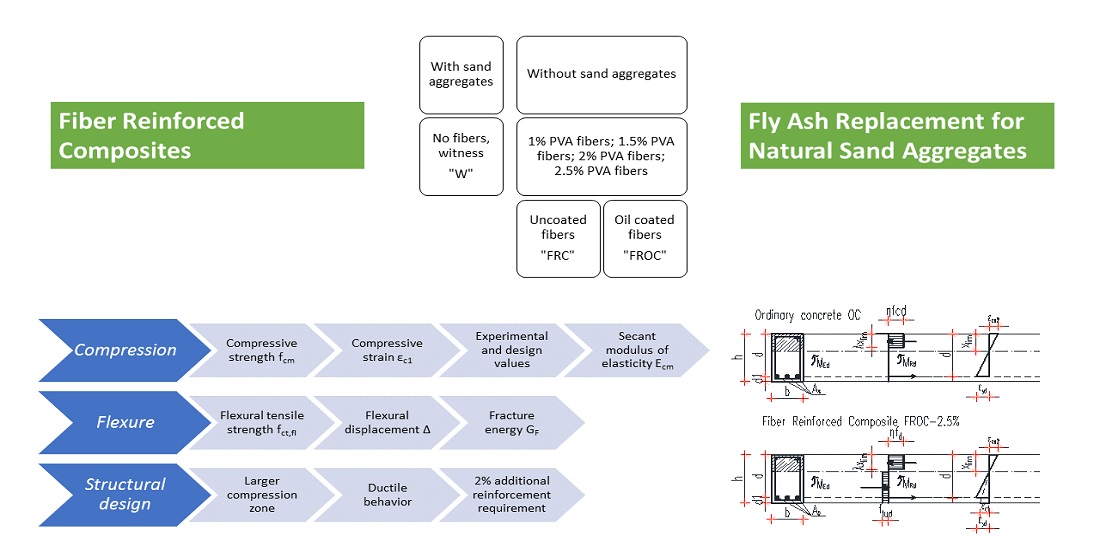 This research aimed to develop a Fiber Reinforced Composite (FRC) by entirely substituting natural sand aggregates with industrial fly ash and silica fume. Two factors were investigated: incorporating oil coated PVA fibers and uncoated PVA fibers. To determine the optimal mix, different fiber volumes were tested, yielding eight distinct concrete matrices. Additionally, a reference composition (W) was included, featuring fine aggregates and the same cement dosage as the FRC mixes, but without fibers. The W composition is designed to compare the performance of the FRC compositions against a traditional cementitious matrix with fine aggregates and to isolate the impact of aggregate replacement alone. In the end, there were nine experimental compositions. Their main characteristics are depicted in