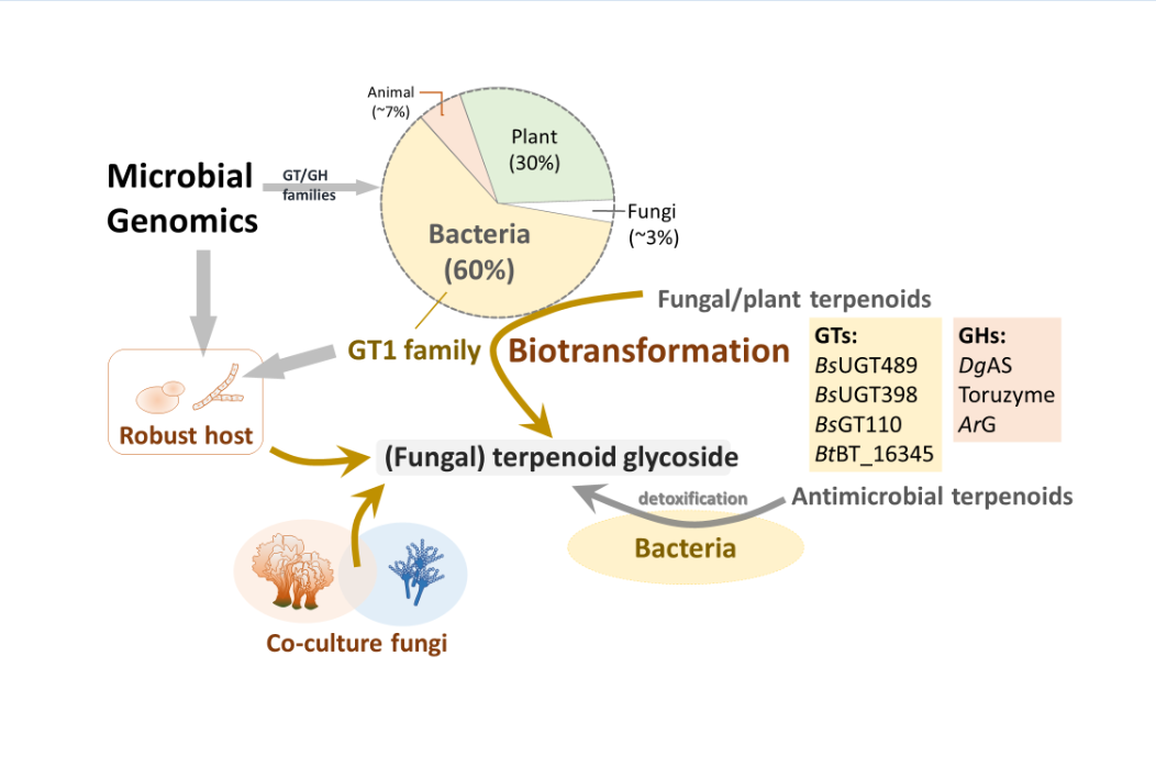 Strategies for searching for novel terpenoid glycosides. Bacterial GTs may biotransform plant and fungal metabolites into glycosides, such as terpenoids and phenolics, which may alter the activity of the original metabolites in terms of solubility, bioavailability, and detoxification. On the basis of reality, one may recombinase and validate novel GTs or GHs from bacterial genomes or integrate functional gene clusters into suitable hosts. In addition, co-culturing microbes with natural compounds or precursors may also help isolate novel derivativities.