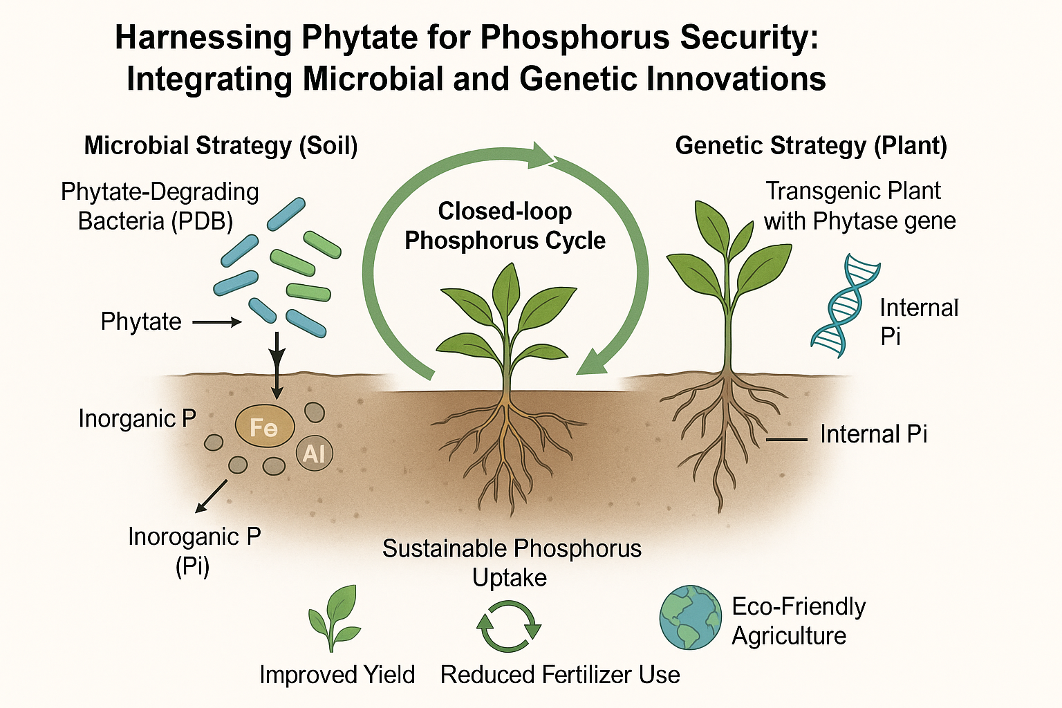 Phosphorus is one of the most important macronutrients required for plant development, essential for energy transfer (ATP), signal transduction, and biosynthesis of nucleic acids and membranes (Khan et al., 2023; Fan et al., 2021). Despite its importance, phosphorus use in agriculture is highly inefficient, with a significant fraction of applied fertilizers becoming immobilized in soils or lost through runoff, contributing to eutrophication and ecological harm. Compounding the issue is the global dependence on non-renewable rock phosphate, which is unevenly distributed, expensive to mine, and projected to become increasingly scarce in the coming decades (Illakwahhi et al., 2024; Walsh et al., 2023). Ironically, agricultural soils and crop residues already contain large amounts of P, mainly in the form of phytate (myo-inositol hexakisphosphate), the principal storage form of organic phosphorus in seeds and plant tissues. However, phytate remains largely inaccessible to plants due to their natural deficiency in phytase enzymes, which are required to hydrolyze it into plant-available inorganic phosphate (Hollenback 2024; Raguet et al., 2024). Phytate accounts for up to 50–80% of the total organic phosphorus in soils and seeds, yet plants cannot directly utilize it due to the lack of phytase enzymes required to break it down (Liu et al., 2022). To address this paradox, researchers have turned to two promising strategies. The first involves the use of phytate-degrading and phosphate-solubilizing microbes to mobilize phosphorus from soil-bound sources. The second utilizes genetic engineering to create transgenic crops capable of producing phytase internally, thereby accessing their own phosphorus reserves (Pan and Cai 2023; Vashishth et al., 2023). This review aims to critically assess both strategies, individually and in combination, and explore how they can be integrated to create a closed-loop phosphorus cycle in agriculture. By evaluating recent advances, current challenges, and future directions, we propose a dual-strategy model that leverages microbial ecology and plant biotechnology to enhance phosphorus use efficiency, reduce fertilizer dependency, and contribute to sustainable agricultural systems.