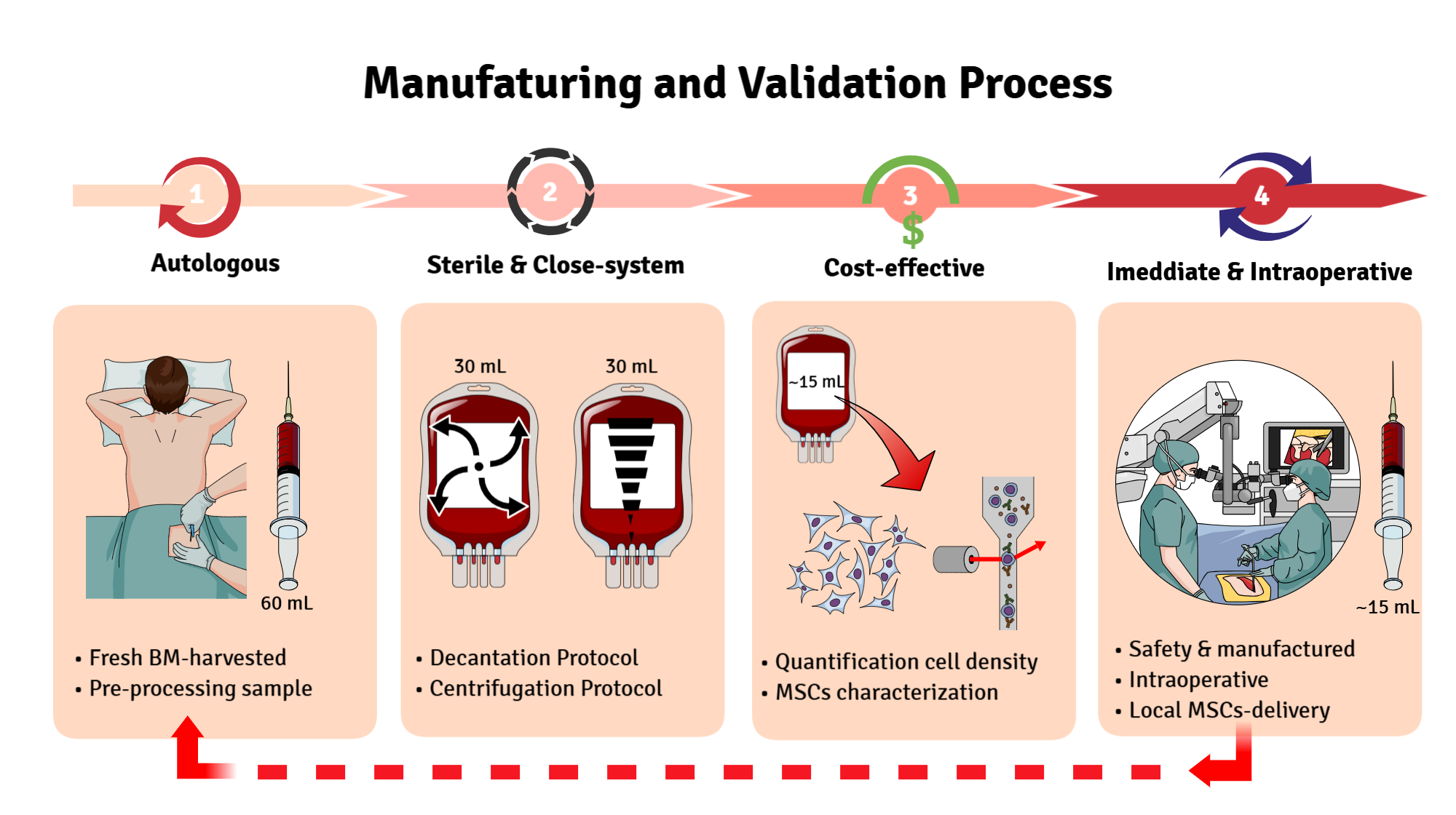 17]. Thus, the objective of our study is to compare two distinct protocols for obtaining a concentrate of MSCs in a sterile closed system. By providing detailed, step-by-step guidance, with low-cost for immediate use during surgery, while also consolidating knowledge about (i) the standardization of the autologous protocol, (ii) the composition of the bone marrow stem cell concentrates, and (iii) the reproducibility of the applied techniques that can be applied in smaller centers with poor laboratory technology and healthcare facilities. This work, finally, aims to bridge current gaps in cell protocol-manufacturing and promote the sustainable integration of cell therapies into clinical practice.
