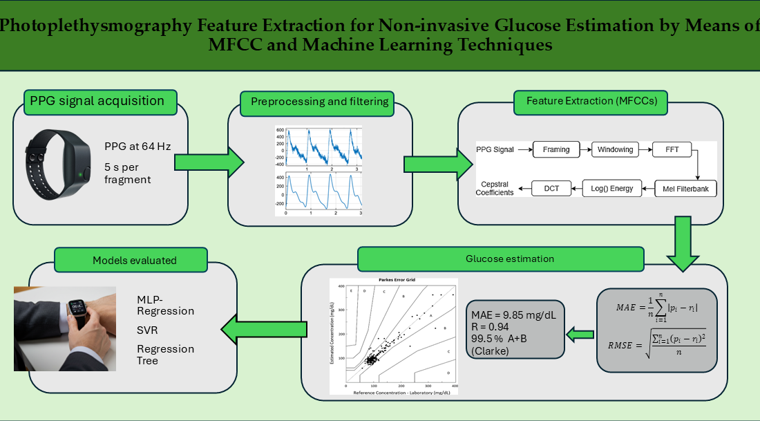 This article presents in section II detailed information regarding the database collection and selection criteria, raw signal processing, feature extraction techniques, and the proposed glucose estimation methods. The performance of each system is reported in section III, where the best combination of feature extraction and estimation methods was evaluated using the Clarke Error Grid Analysis and the Park Error Grid. Finally, Section IV offers final remarks, discusses the implications of the results, and outlines future research directions