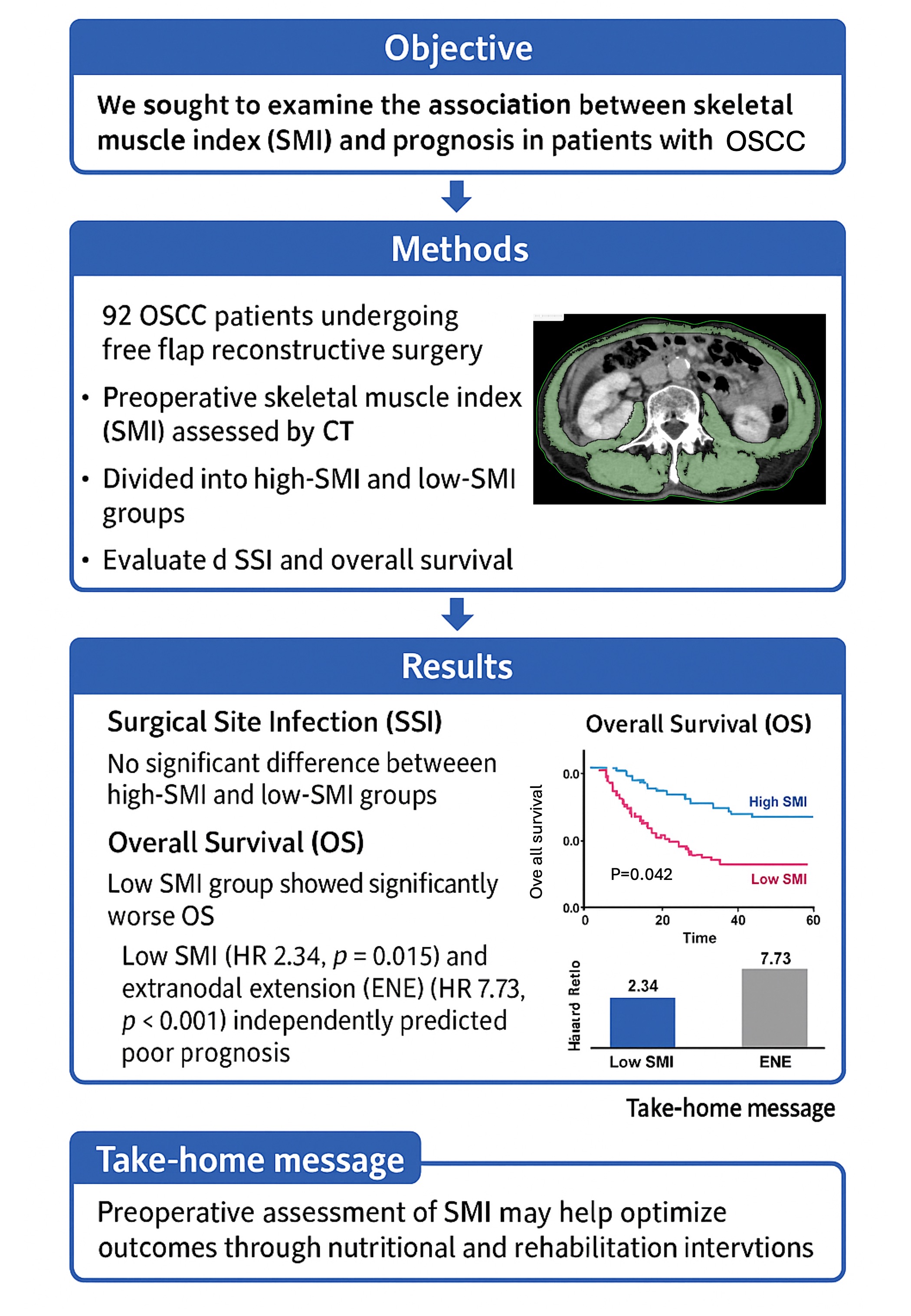 - Makiguchi, T.; Yamaguchi, T.; Nakamura, H.; Suzuki, K.; Harimoto, N.; Shirabe, K.; Yokoo, S. Impact of skeletal muscle mass volume on surgical site infection in free flap reconstruction for oral cancer. Microsurgery 2019, 39, 598–604. [Google Scholar] [CrossRef] [PubMed]