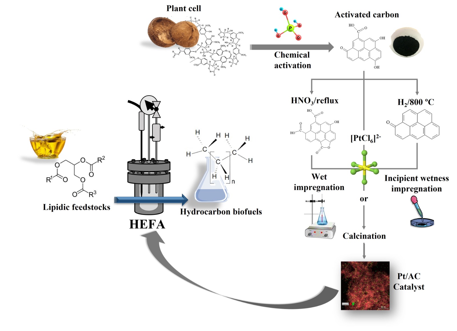 In the described scenario, the present work aimed to develop sulfur-free heterogeneous catalysts with improved activity and stability in the HDO of lipidic feedstocks. To reach this goal, homemade activated carbon (AC) was used as the support and metallic Pt as the active phase.