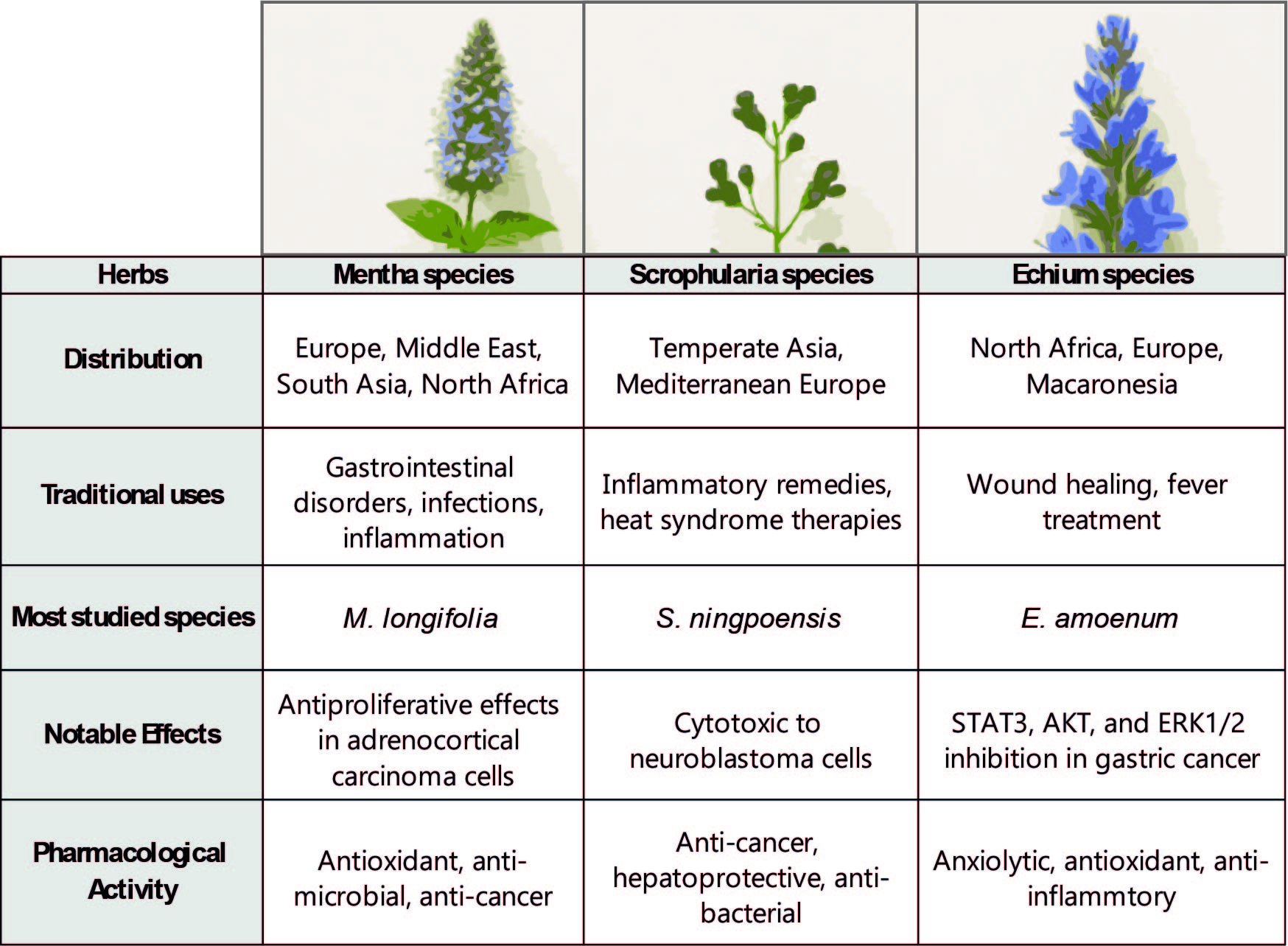 | Mentha | Defined as 18–30 species across five sections: Mentha, Preslia, Audibertia, Eriodontes, Pulegium. Includes M. spicata, M. aquatica, M. arvensis, M. longifolia [20,21,96,97] | Aromatic, herbaceous perennials with extensive stolons [97] | Widely distributed: Northern Pakistan, Europe, Nepal, India, Western China, Germany, UK, Egypt, Nigeria, Turkey [21] | Mentha longifolia |