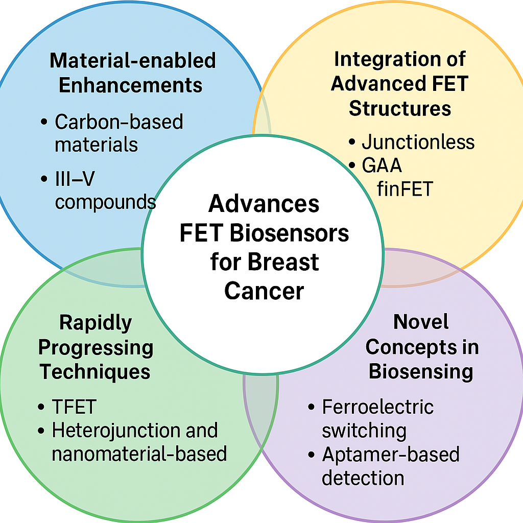 | Poc-MGOTFET | C-erbB-2 in serum and saliva | Modified Gate Oxide TFET with Pocket and Dual Cavity | TCAD Sentaurus (2D simulation) | Interface charge modulation; Enhanced tunneling rate; Extended gate structure; Dual cavity under gate | Sensitivity increased by 10⁶; Improved ION/IOFF ratio | [67] |