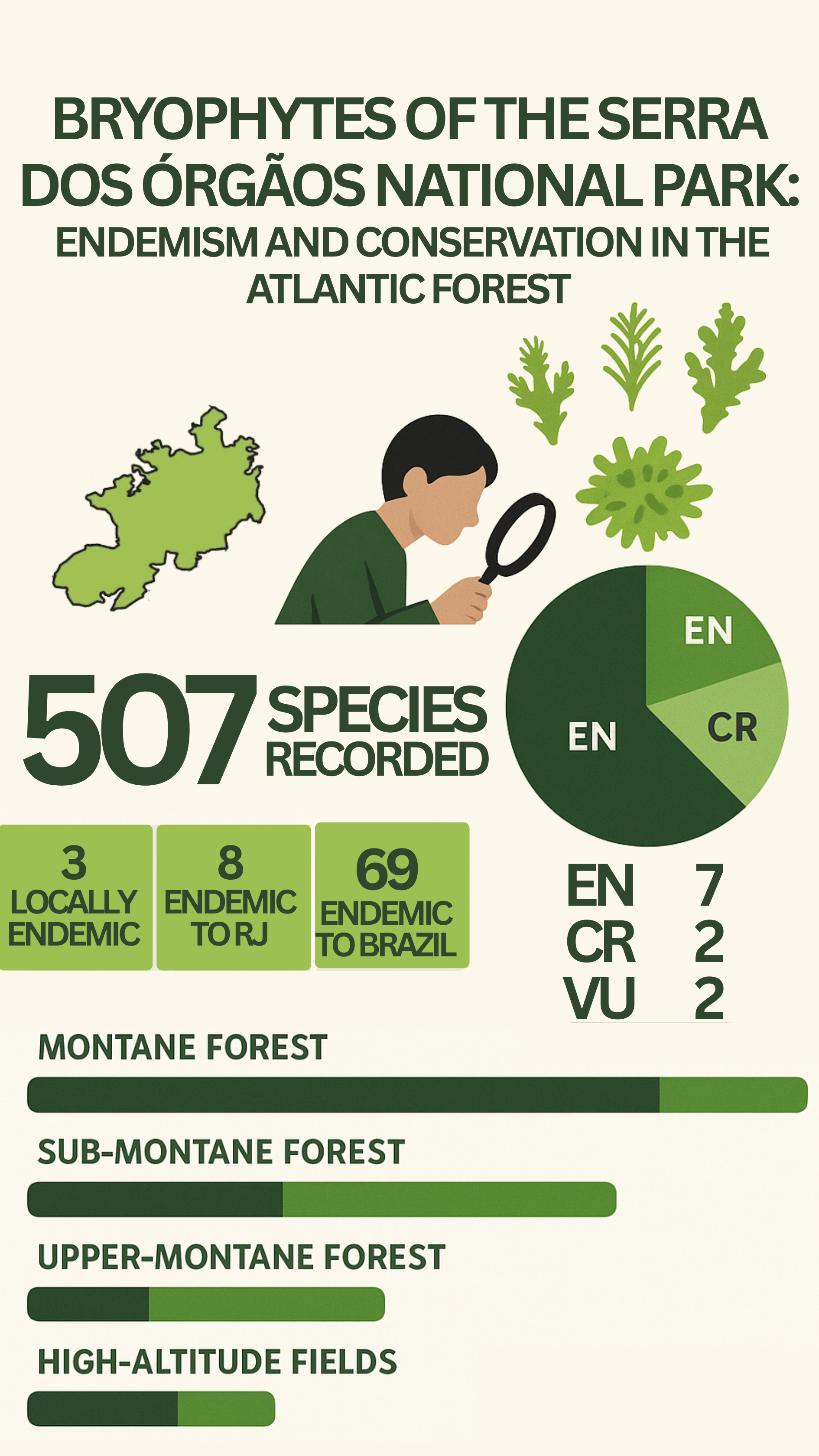 - Santos, N.D.; Oliveira, J.R.P.M.; Silva, L.T.P.; Gonçalves, M.T.A.; Peralta, D.F. Campos de altitude: ecossistemas prioritários para a conservação de briófitas. In Botânica: para que e para quem? Desafios, Avanços e Perspectivas na Sociedade Contemporânea; Moura, C.W.N., Shimizu, G.H., Eds.; Sociedade Botânica do Brasil: Brasília - DF, Brasil, 2022; pp. 92–99. [Google Scholar]