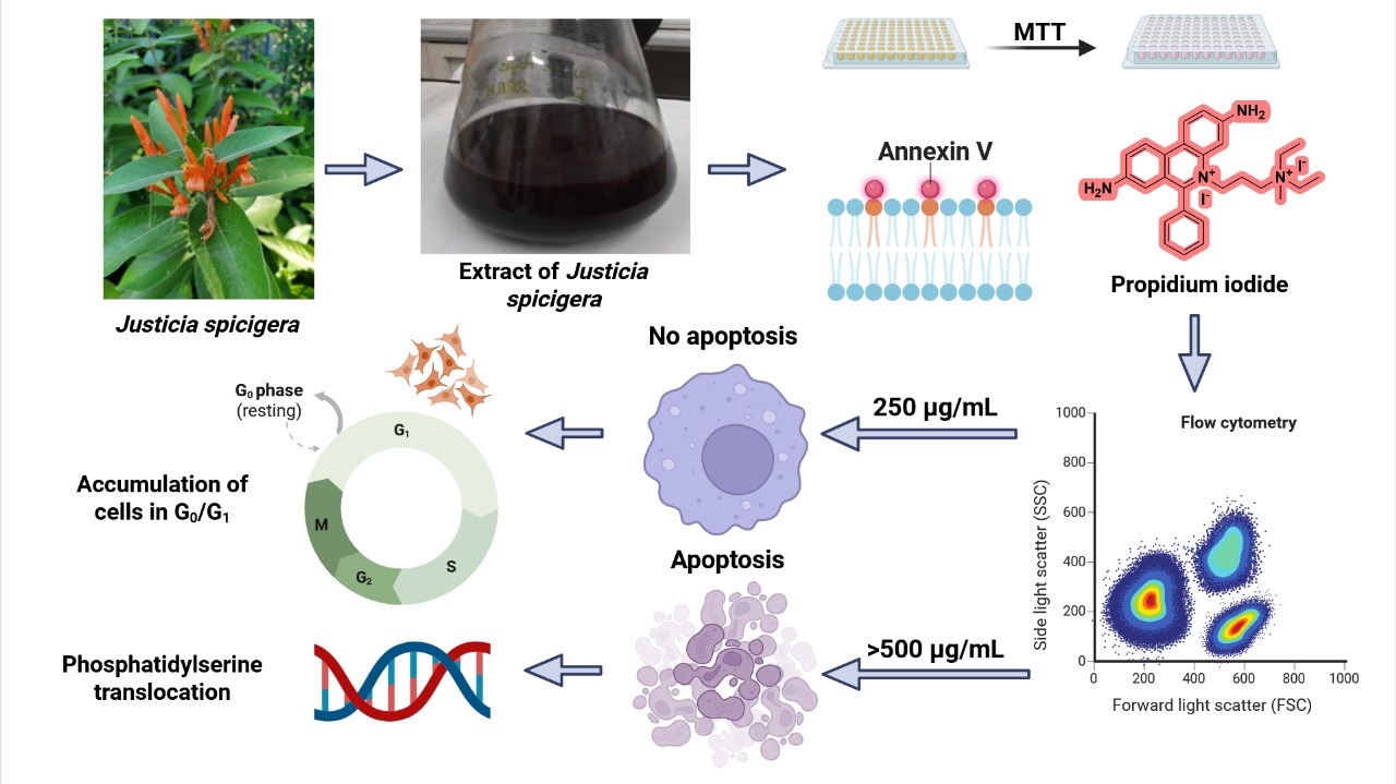 Justicia spicigera, a plant widely used in Mexican ethnomedicine, has attracted scientific interest due to its diverse bioactive compounds, including flavonoids, phytosterols, and anthocyanins, which exhibit anticancer, anti-inflammatory, and immunomodulatory properties [