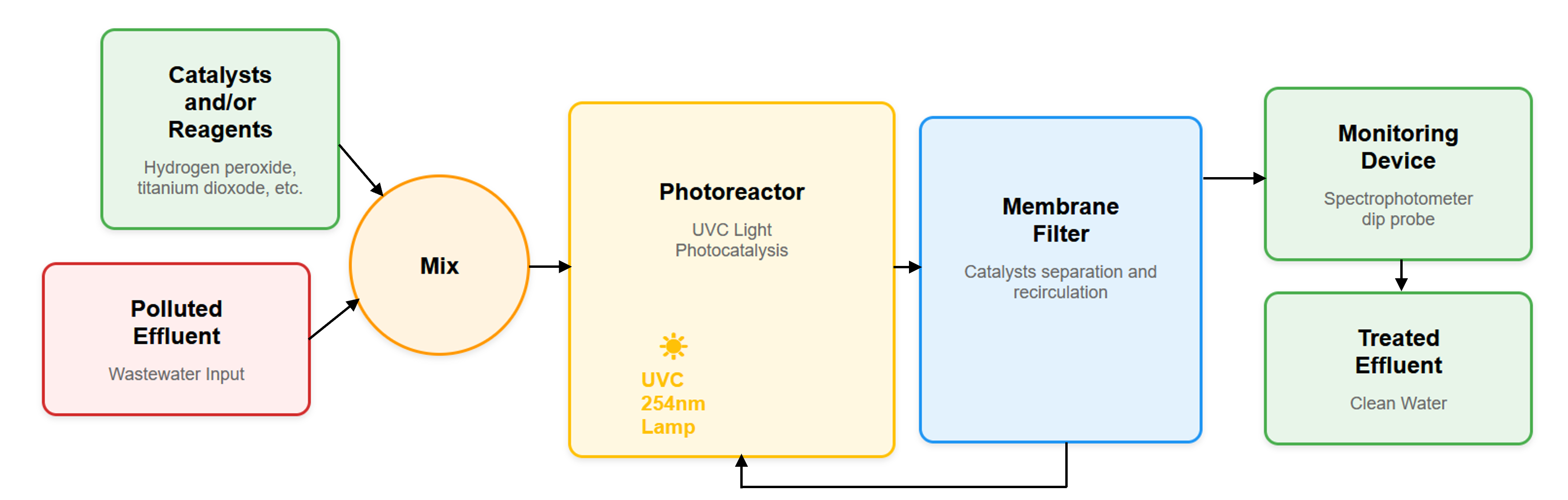 28]. Roughly 23 % of these studies investigate heterogeneous photocatalysis—primarily TiO₂-based systems—while about 12 % explore direct photolysis or combined UV/H₂O₂ processes. Most laboratory studies employ batch-mode reactors or recirculating flow setups in which the effluent repeatedly passes through the catalyst or reactive membrane [