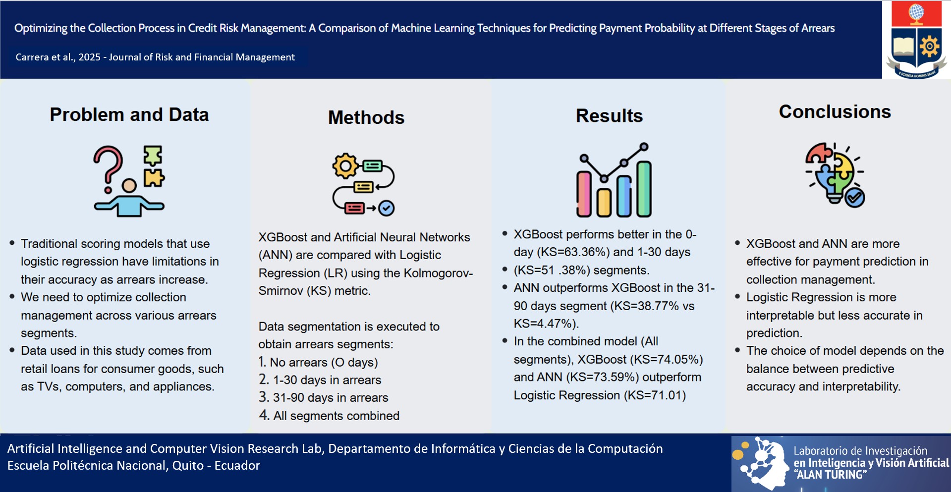 - This paper compares three supervised learning models: logistic regression, XGBoost, and artificial neural networks, using the Kolmogorov-Smirnov (KS) statistic as a performance metric. The XGBoost algorithm consistently demonstrated superior performance across various segments, achieving accuracy rates of 63.36% for segments with no lags, 51.38% for segments with 1-30 lags, and 74.05% when all segments were analyzed together. These results indicate that XGBoost is more effective for binary classification compared to both logistic regression and neural networks.