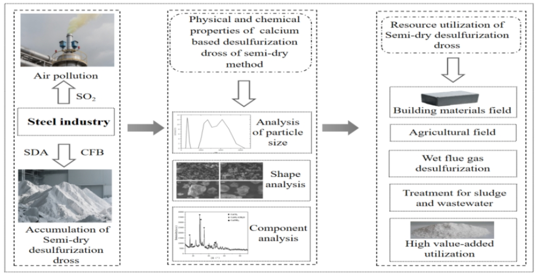 17]. The steel industry emited about 20 million tons of semi-dry desulfurization dross every year nationwide, and the semi-dry desulfization dross, as a by-product of desulfurization after processing, had become a bulk solid waste, urgently needing mature and reliable treatment technology to achieve comprehensive utilization of Semi--dry desulfurization dross [