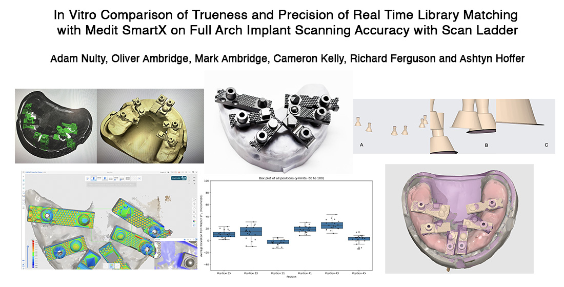 Figure 1, are uniquely suited for this workflow and feature novel attributes. Unlike traditional scan bodies, each Scan Ladder component is geometrically distinct in shape and length, allowing clinicians to customise positioning for each patient case to reduce gingival interference and improve scanning efficiency. The irregular surface geometry facilitates reliable AI recognition during scanning, while the shared library model standardises digital matching across all scan body positions. Furthermore, the Scan Ladder’s horizontal alignment structure reduces the frame distance between scan bodies, minimising distortion introduced during stitching and the irregular design and random surfaces unique to Scan Ladder which aims to enable precise cross-arch calibration. This study will assess the trueness and precision of the Medit SmartX using the Scan Ladder system as seen during scan in