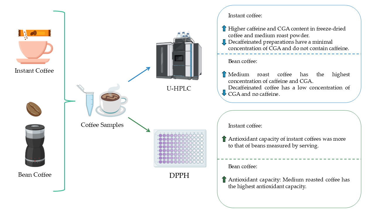 Significantly, this work is the first systematic characterization of caffeine, CGAs and antioxidant capacity in instant and whole bean coffees available on the Chilean market, providing unprecedented evidence for the national context. The absence of previous studies of this type in Chile reinforces the importance of these findings and opens up the need for future research that considers both the diversity of commercial matrices and the impact of these variations on the dietary exposure of the population.
