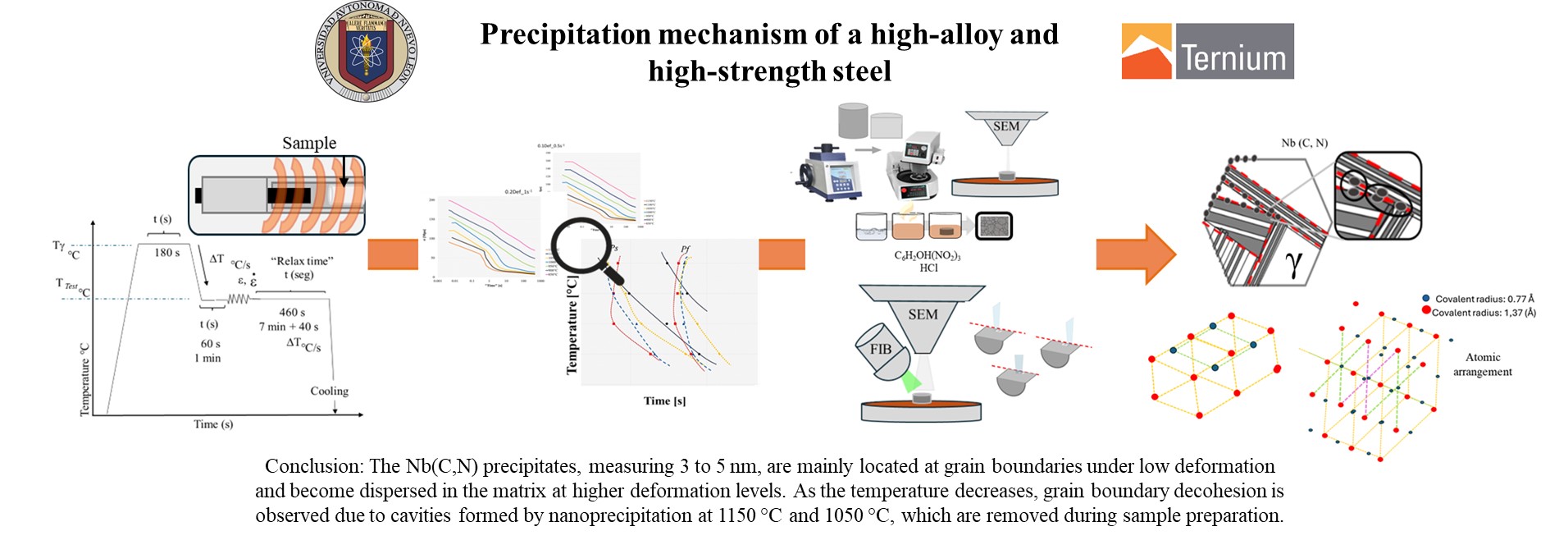 For the study of the mechanism of deformation-induced precipitation, kinetics, interface sizes and morphologies in the steel during the thermomechanical process for a high alloy and high strength steel, a steel provided by the industrial sector was used.