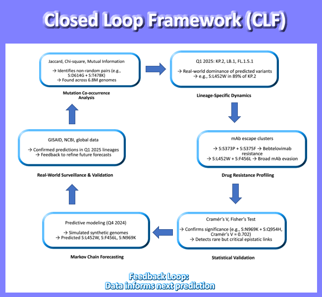 Integration of mutation co-occurrence, drug resistance, and Markov forecasting reveals predictable evolutionary pathways. Mutation clusters - not single substitutions - drive immune escape and transmissibility. This framework shifts surveillance from reactive to proactive