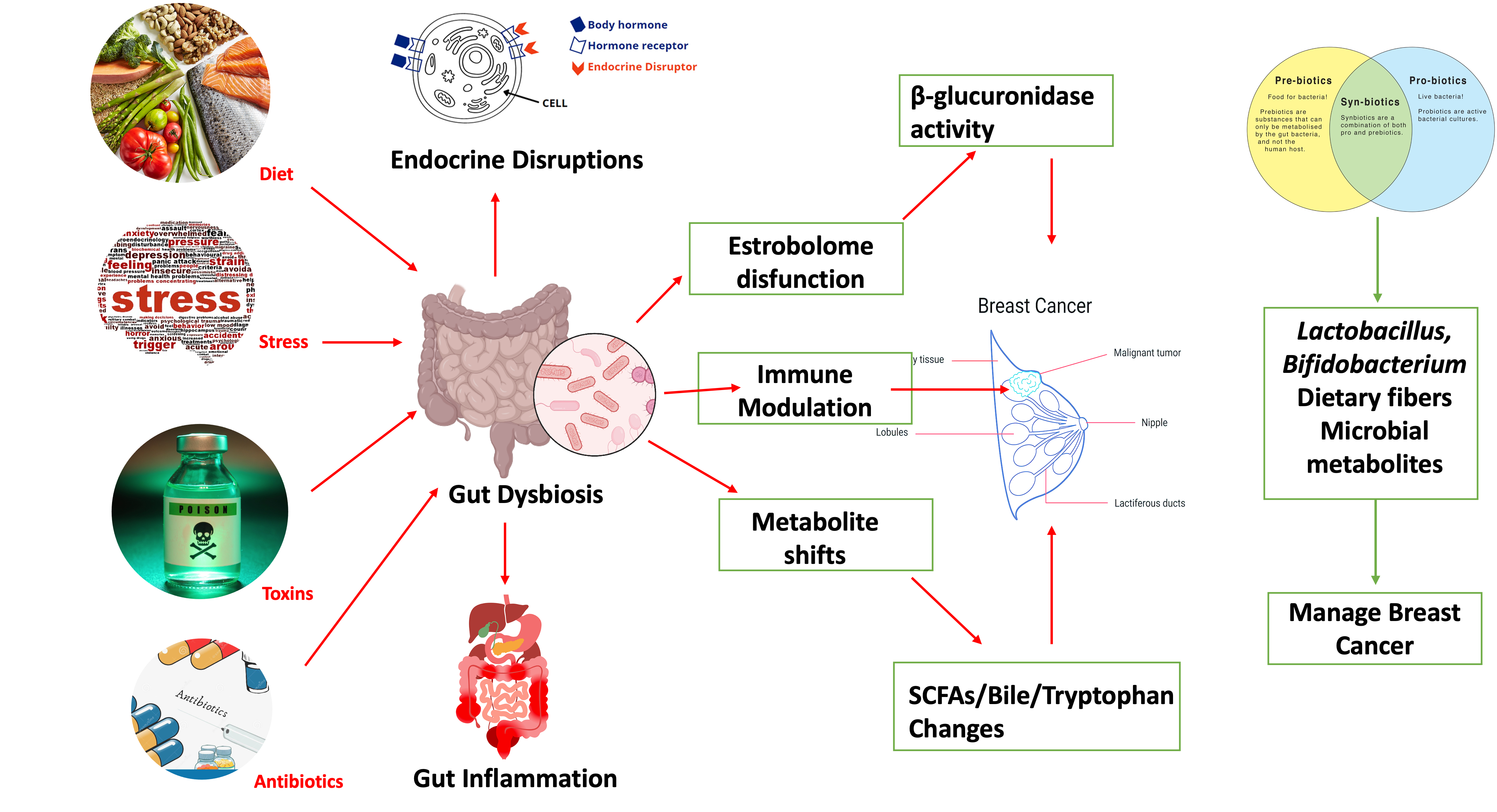 The human gut microbiota, a dense and dynamic microbial ecosystem, is essential to numerous physiological functions, ranging from nutrient metabolism to immune regulation and endocrine signaling. Its balance and diversity are critical for sustaining host health. However, when the composition, density, or functionality of the microbiota becomes disrupted, a condition termed “dysbiosis” arises. Gut dysbiosis reflects a pathological imbalance in the microbial community, and growing evidence implicates it as a key contributor to a broad spectrum of chronic diseases, including metabolic syndrome, autoimmune conditions, neurodegenerative disorders, and various cancers, notably breast cancer [