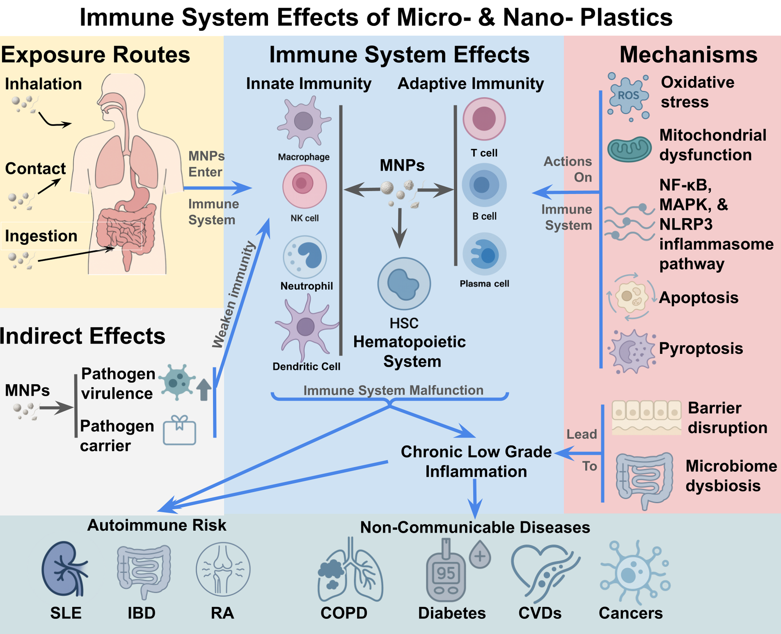 This review summarizes current knowledge on the biodistribution of MNPs, their effects on immune cell function, roles in immune regulation, and underlying molecular mechanisms. These insights provide a foundation for developing preventive and therapeutic strategies aimed at mitigating the immunotoxic consequences of MNPs exposure.