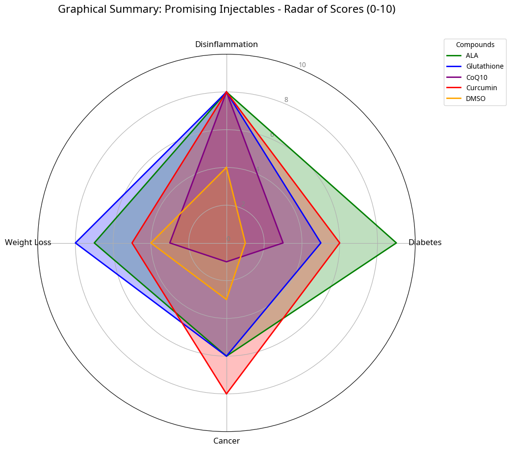 Integrated injectable therapies combining DMSO, CoQ10, ALA, curcumin, and miR-146a mimics offer multimodal intervention against chronic inflammation in cancer, obesity, and T2D. Personalized medicine approaches using circulating miRNA profiles can optimize patient stratification and treatment outcomes [55]. Careful evaluation of immunosuppression and off-target effects is imperative [56]. Ongoing clinical trials and advancements in nanodelivery systems will support translation into routine care.