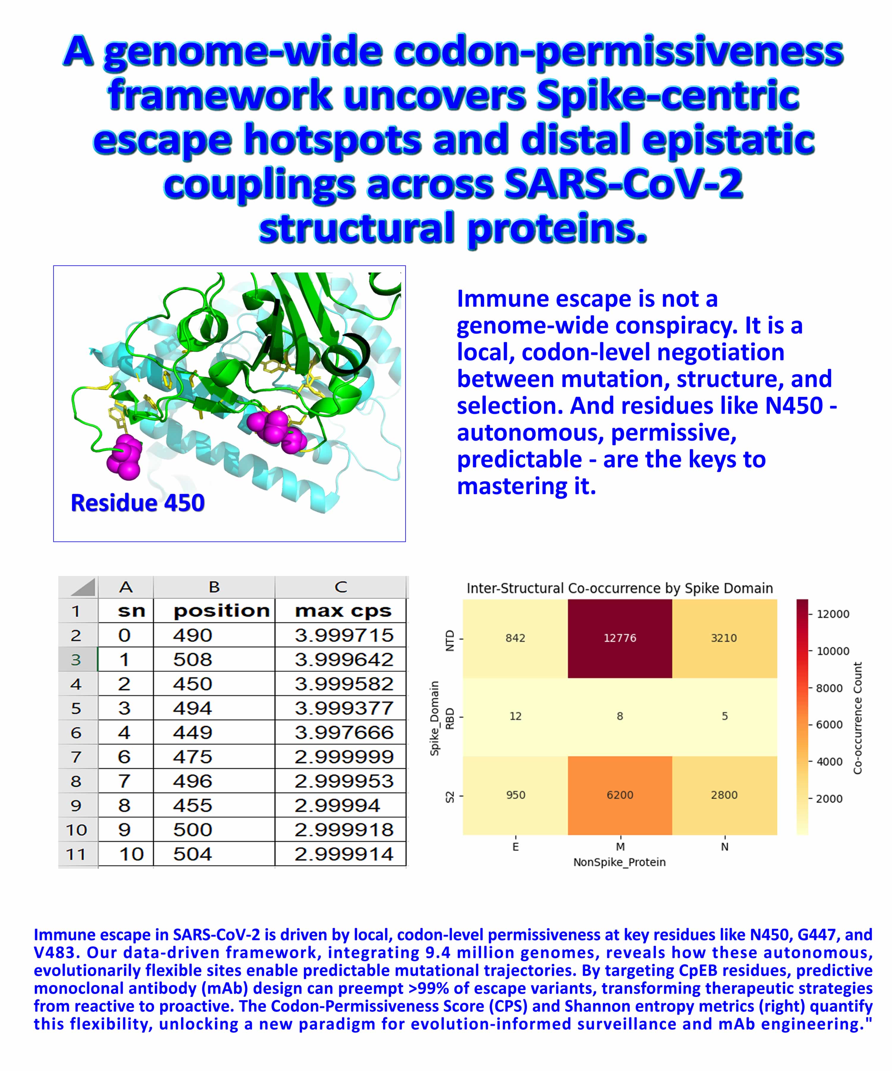 This autonomy is not a vulnerability it’s a therapeutic opportunity. It means monoclonal antibodies (mAbs) targeting these sites need not account for complex, genome-wide epistasis. Instead, they can be engineered to anticipate only the local, codon-driven mutational spectrum of each residue. If strong signals are found in future studies we still may be able to conclude those residues at E/M/N level via using CpEB scoring.