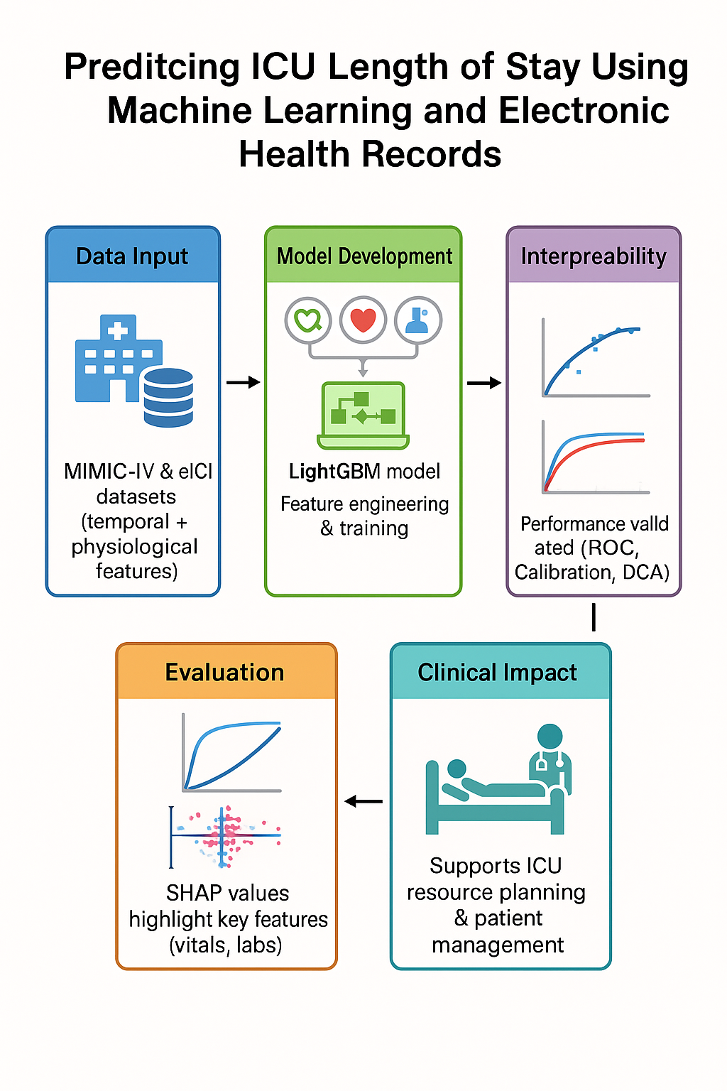 By combining time-sensitive feature engineering with rigorous evaluation, this study contributes threefold. To begin with, it empirically shows that fine-grained temporal patterns on the first day of ICU stay can be predictive of the LOS significantly better than traditional summaries. Second, it underlines the necessity of calibration and decision-analytic measures, to ensure that not only statistical but also clinically interpretable results are achieved. Third, it situates the LOS prediction in the broader discussion of the generalization of models and fairness; the importance of external validation and subgroup analysis of performance; and making these considerations explicit and understood before the models are implemented for clinical use (Efthimiou et al., 2024; Lim et al., 2024).