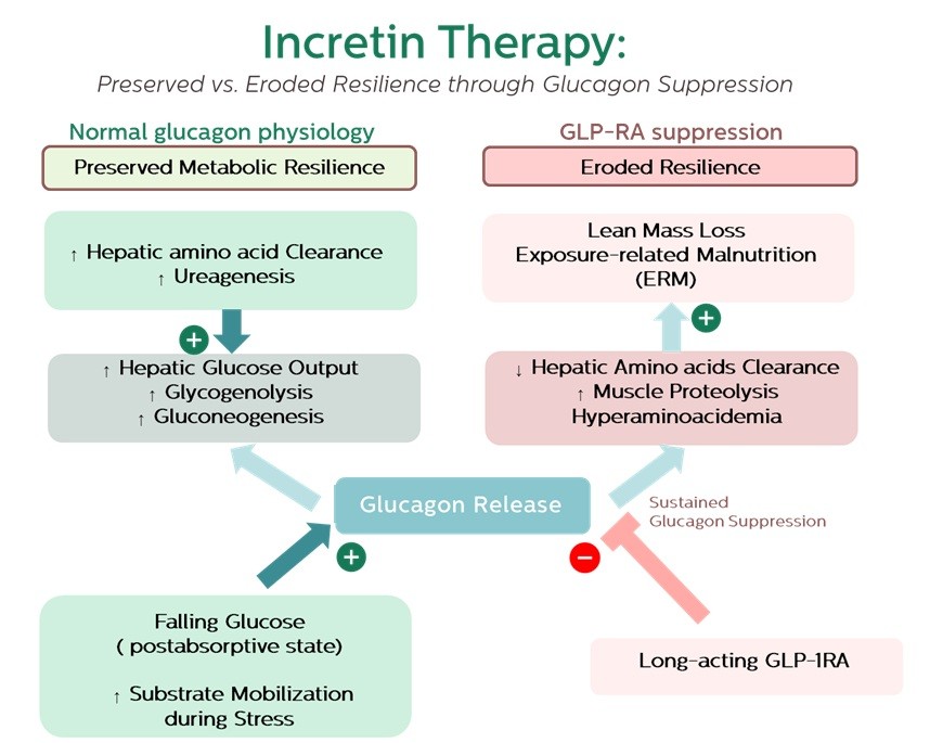 GLP-1RA therapy epitomises the duality of modern metabolic medicine: transformative benefits paired with under-recognised risks. By highlighting the overlooked role of sustained glucagon suppression, we extend the discussion beyond weight and glucose endpoints to include long-term muscle health and adaptive capacity. Framing these effects within ERM provides a translational model for recognising early warning signs and balancing the promise of GLP-1RAs with the preservation of resilience.