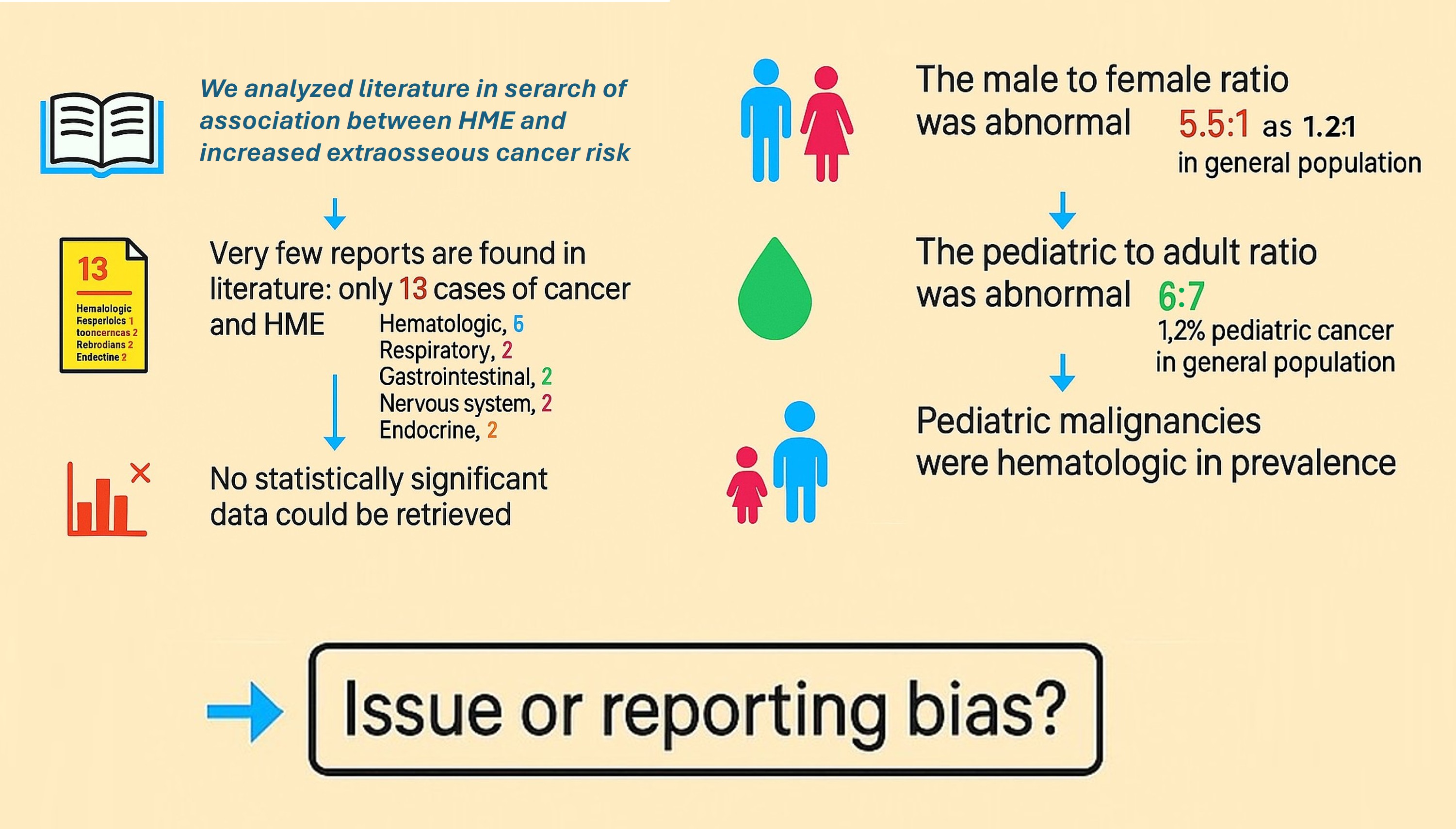 Based on the currently available evidence, a definitive association between HME and non-skeletal malignancies cannot be established. This review identified an apparent overrepresentation of pediatric hematologic malignancies (4 of 6 pediatric cases), but the small sample size, absence of denominator data, and substantial risk of publication bias limit causal inference. The findings are hypothesis-generating and require validation through large-scale, population-based cohort studies with appropriate controls. Although no screening recommendations can currently be made, clinicians should maintain awareness of potential hematologic malignancies in pediatric patients with HME presenting with unexplained constitutional symptoms. Future research incorporating clinical, genetic, and epidemiological data is essential to determine whether HME confers genuine increased risk for specific non-skeletal cancers.