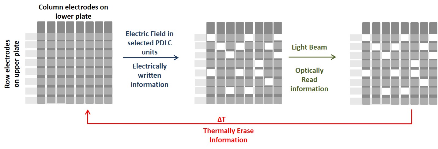 Optical information storage in PDLCs exploits electrically written, optically read, and thermally erased operations within a multiplexed pixel array, where each pixel is a PDLC unit exhibiting a permanent memory effect (PME). Pixels are individually addressable, switching between transparent (ON) and opaque (OFF) states depending on the applied electric field.