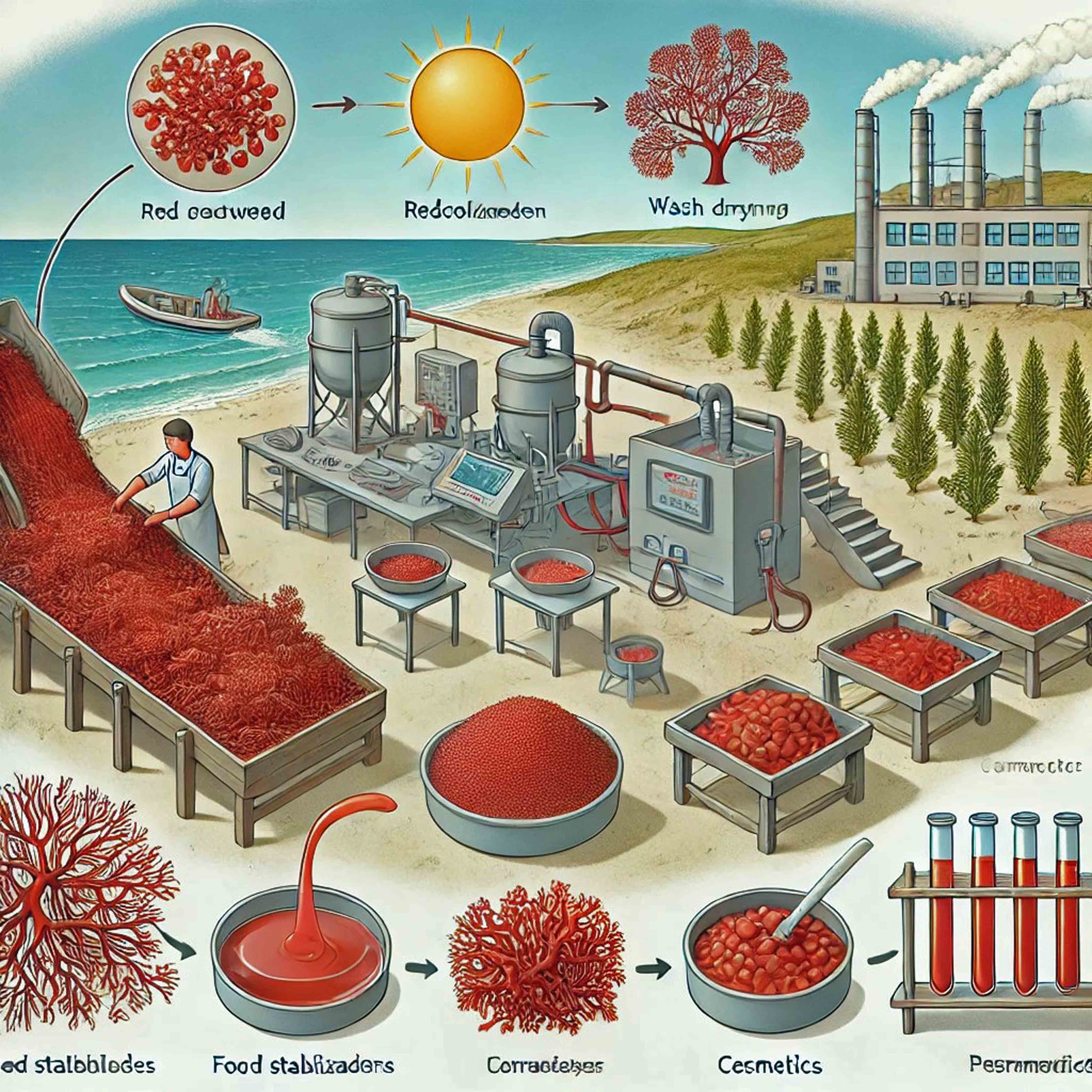 Phycocolloids derived from red algae, including agar, carrageenan, and related sulfated polysaccharides, have attracted growing interest due to their multifunctional properties and wide-ranging industrial applications. These marine biopolymers exhibit unique structural characteristics and bioactivities that support their use in food, pharmaceutical, cosmetic, and biomedical sectors. This review provides a comprehensive synthesis of current knowledge on red algae phycocolloids, beginning with their biological origin, biosynthetic pathways, and ecological roles. It highlights recent advances in extraction and purification technologies, with a focus on improving yield, safety, and environmental sustainability. The review also explores emerging applications in drug delivery, tissue engineering, and green technologies, underscoring their potential in sustainable innovation. Key challenges—including regulatory constraints, scalability, and the need for interdisciplinary collaboration—are discussed, along with future directions for research and industrial development. This work aims to support the strategic integration of red algae phycocolloids into next-generation biotechnological solutions.