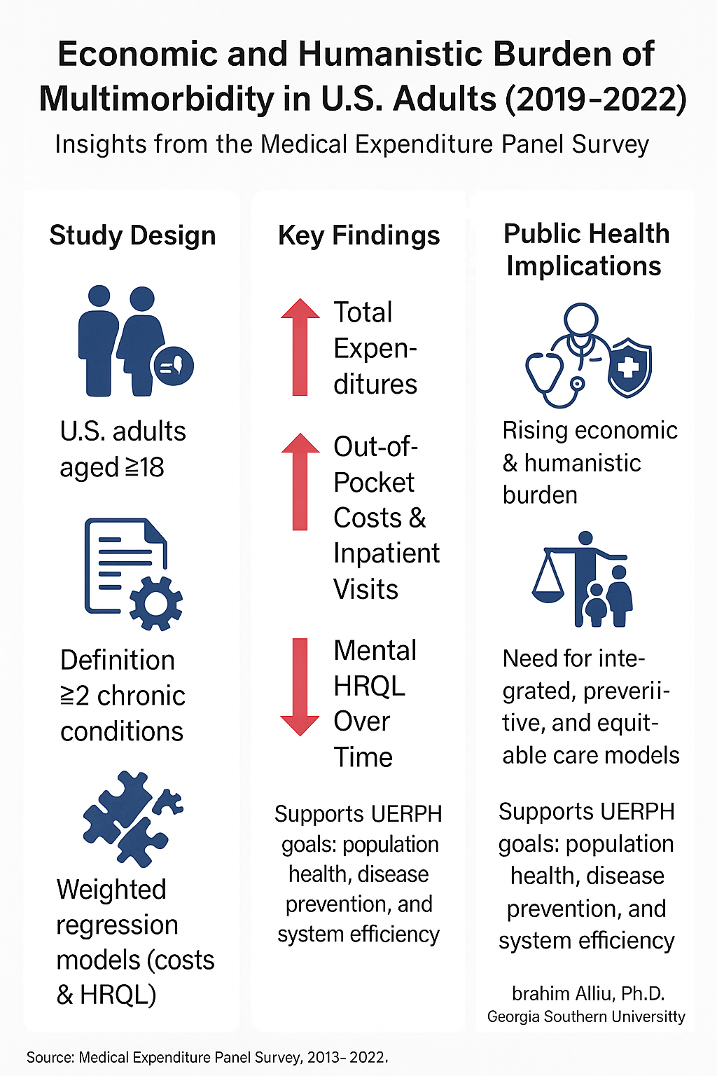 However, while the high cost of chronic disease is well-documented, most research provides a static, cross-sectional view of this burden. This approach fails to capture the dynamic nature of MM in a longitudinal scope, leaving a critical gap in our understanding of how the economic and humanistic consequences evolve over time. As a result, policymakers and health systems lack granular, longitudinal evidence on the heterogeneity within the MM population, specifically, which combinations of conditions drive the most significant costs and quality of life reductions in the long term. Without this longitudinal perspective, efforts to design effective, value-based care models that target the highest-need, highest-cost patients are hindered. This study aims to address that knowledge gap by characterizing and comparing the four-year trajectories of economic and humanistic burdens across distinct, clinically defined clusters of MM. Using longitudinal data from the 2019 – 2022 Medical Expenditure Panel Survey (MEPS), we analyze how total health care expenditures, OOP spending, and HRQL change over time for different patient profiles to inform the development of more precise and efficient value-based interventions.