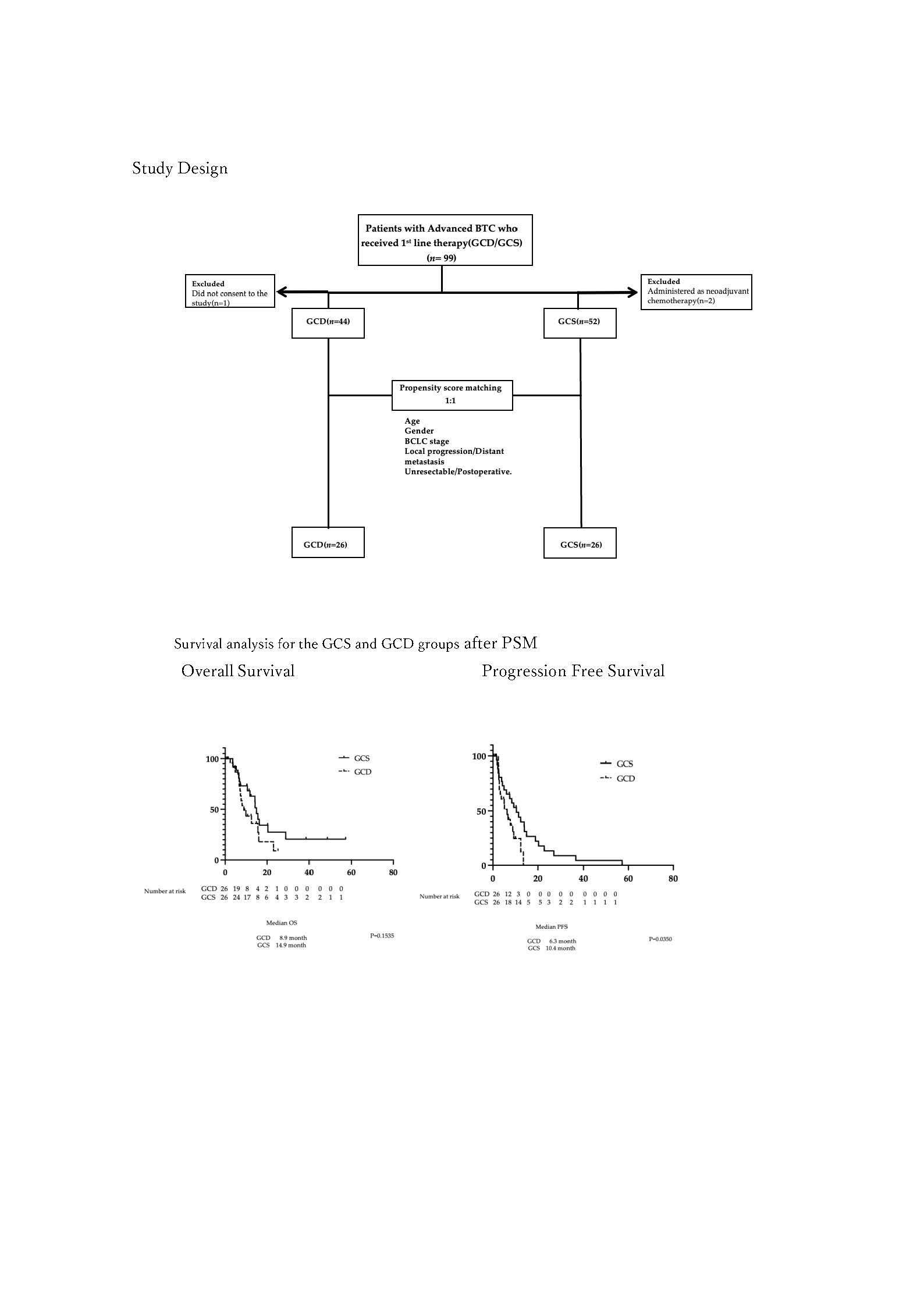 12], no randomised controlled trials directly comparing GCD therapy and GCS therapy have been published. In the present study, we prospectively registered cases undergoing either GCS or GCD therapy to evaluate the equivalence of these therapies for unresectable advanced BTC and to examine treatment costs. We assessed OS, PFS and objective response rates (ORR). Furthermore, we performed propensity score matching (PSM) to adjust for patient background factors and then re-evaluated OS, PFS, and ORR, whilst also examining the costs incurred until treatment completion.