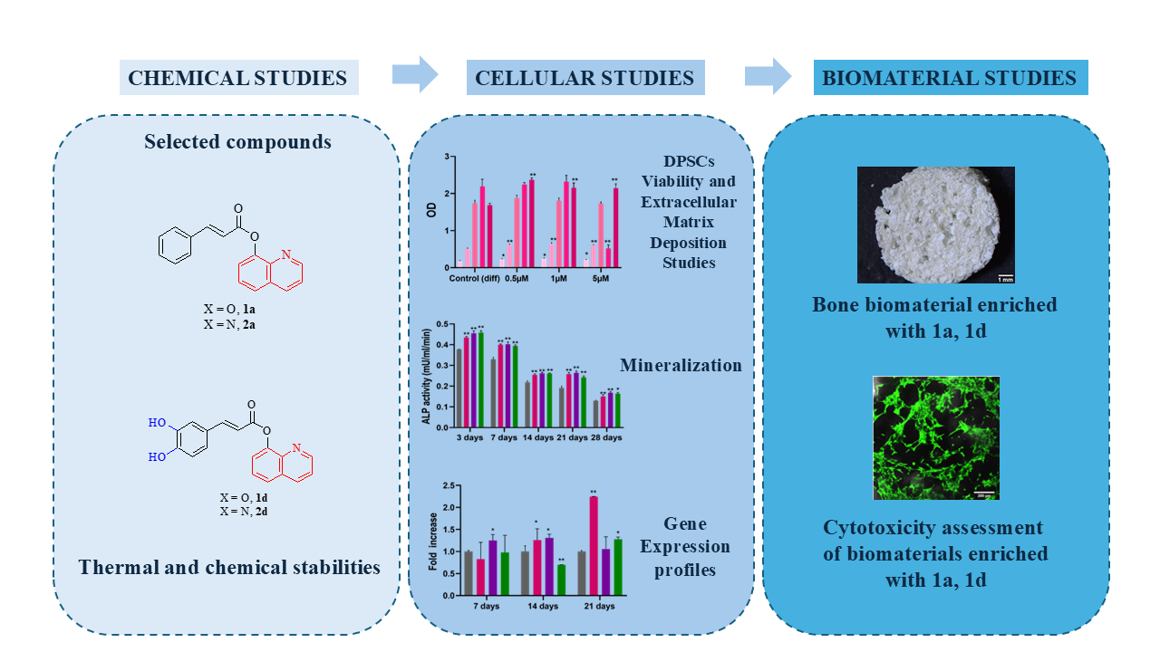 Objectives: Bone defects, resulting from many causes, represent a challenge in maxillofacial and orthopaedic surgery. Regenerative medicine offers promising strategies by introducing exogenous materials to modify the tissue environment and modulate the body's natural healing mechanisms. Dental pulp stem cells (DPSCs) are considered an effective source for tissue repair. Small molecules such as caffeic acid phenethyl ester (CAPE), although having promising effects in promoting bone regeneration, are characterized by low chemical stability, which impairs their clinical application. This study aimed to investigate the bone regenerative capability of four CAPE derivatives, recently synthesized in our laboratory and selected based on previous studies.Methods: DPSCs were induced to osteogenic differentiation in the presence of these compounds (0–5 μM), and cell viability, matrix deposition, alkaline phosphatase activity, and osteogenic marker gene expression were evaluated. In addition, bone biomaterials composed of a chitosan/agarose matrix reinforced with nanohydroxyapatite and enriched with these CAPE derivatives were fabricated and assessed for cytotoxicity and cell adhesion.Results: Two of the tested compounds effectively enhanced DPSC differentiation toward the osteogenic lineage. The fabricated bone biomaterials showed no cytotoxicity and supported cell adhesion. Furthermore, these compounds demonstrated stability under various conditions, confirming their suitability for incorporation into bone biomaterials.Conclusions: The tested CAPE derivatives exhibit promising osteoinductive properties and stability, offering a valid alternative to traditional therapeutic strategies in regenerative medicine.