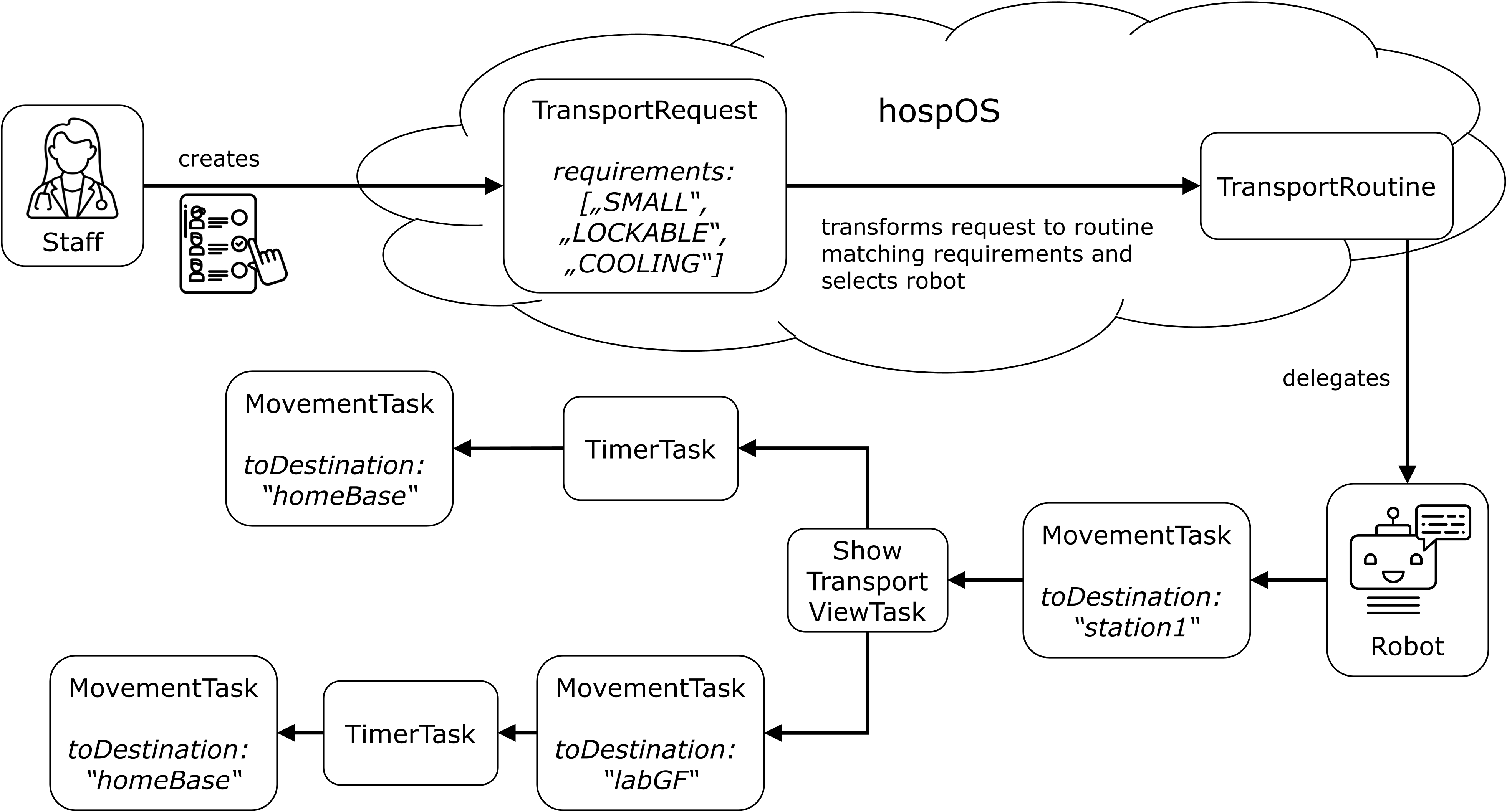 Figure 3. Workflow of hospOS handling a request for transportation of blood samples created by staff working at Station 1. First, a staff member uses the web application to create a transport request, which is matched to a robot available and capable of performing the task by hospOS. Second, hospOS delegates the task using a TransportRoutine to the robot. Subsequently, the robot executes the tasks inside the TransportRoutine to fulfill the task [22].