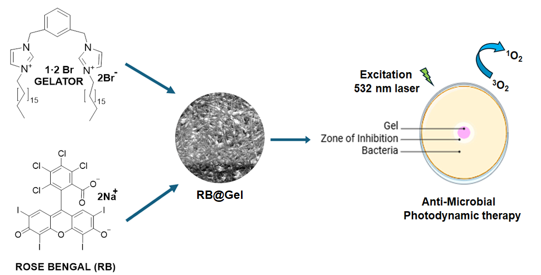 Efficient and localized singlet oxygen (SO) generation is essential for improving antimicrobial photodynamic therapy (aPDT). In this study, a bis-imidazolium-based amphiphilic gelator is used that self-assembles into a supramolecular gel in a water–ethanol medium and incorporates Rose Bengal (RB) as a photosensitizer. The gel network provides a confined environment that promotes SO formation under light irradiation. RB@Gel was characterized with respect to its morphology, degradation behavior, and swelling properties. Biopharmaceutical assessment included in-vitro release, ex-vivo permeation studies and Hen’s Egg Test–Chorioallantoic Membrane (HET-CAM) assay. Rheological measurements confirmed a viscoelastic profile, indicating structural stability and suitability for localized therapeutic applications. SO production within the gel was quantified using tetrasodium 9,10-anthracenediyl-bis(methylene)dimalonate (NaABMA), showing higher efficiency than that of RB in solution. The RB@Gel exhibited significant aPDT against E. coli in a direct-surface contact assay. Overall, the RB@Gel provides a stable, suitable platform capable of efficient SO generation and potent antibacterial activity, highlighting its promise for localized aPDT applications.