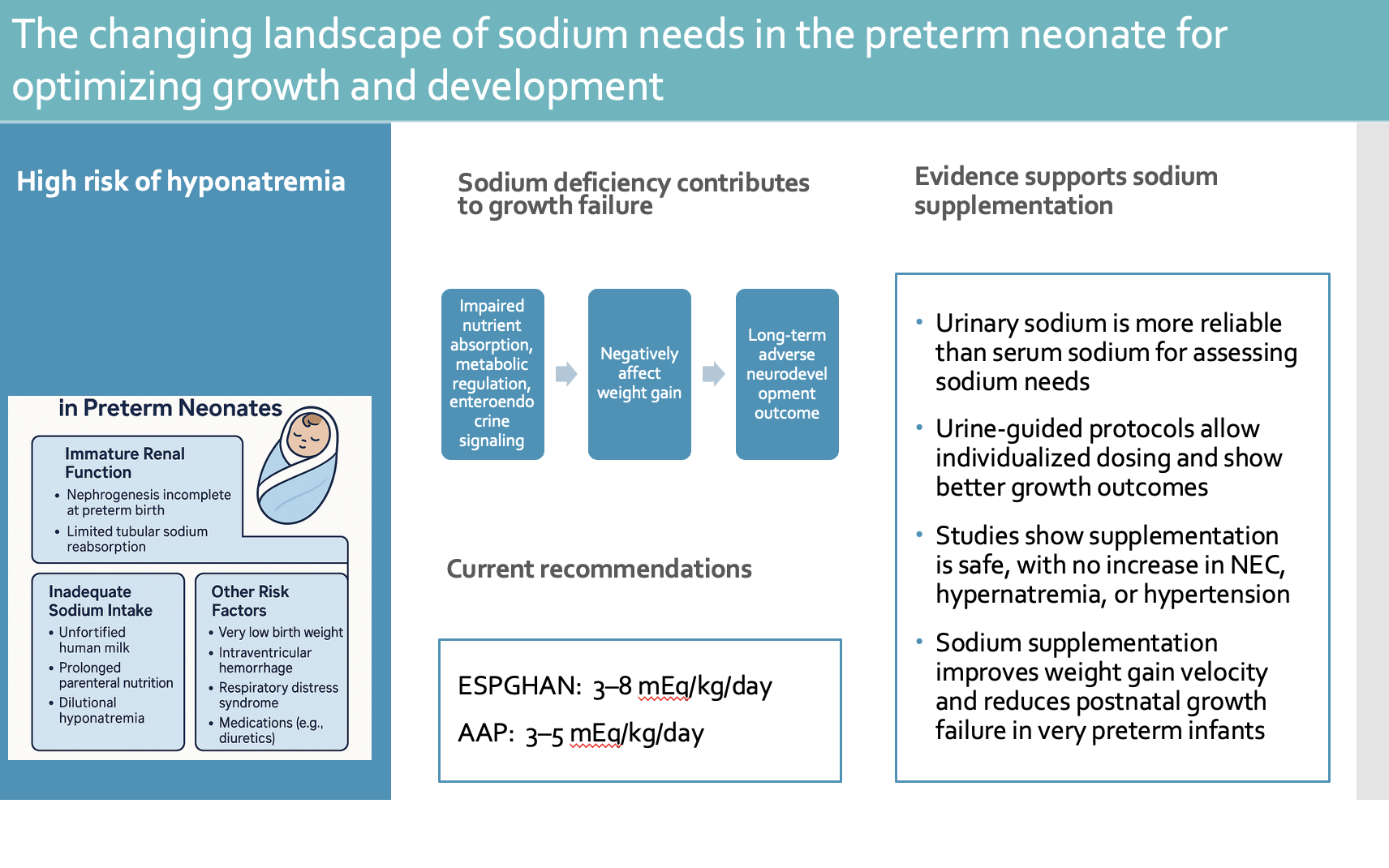 Sodium balance is closely linked to growth and neurodevelopment in preterm infants. Without adequate supplementation, persistent renal sodium losses often lead to negative sodium balance, growth restriction, and potentially adverse neurodevelopmental outcomes [
