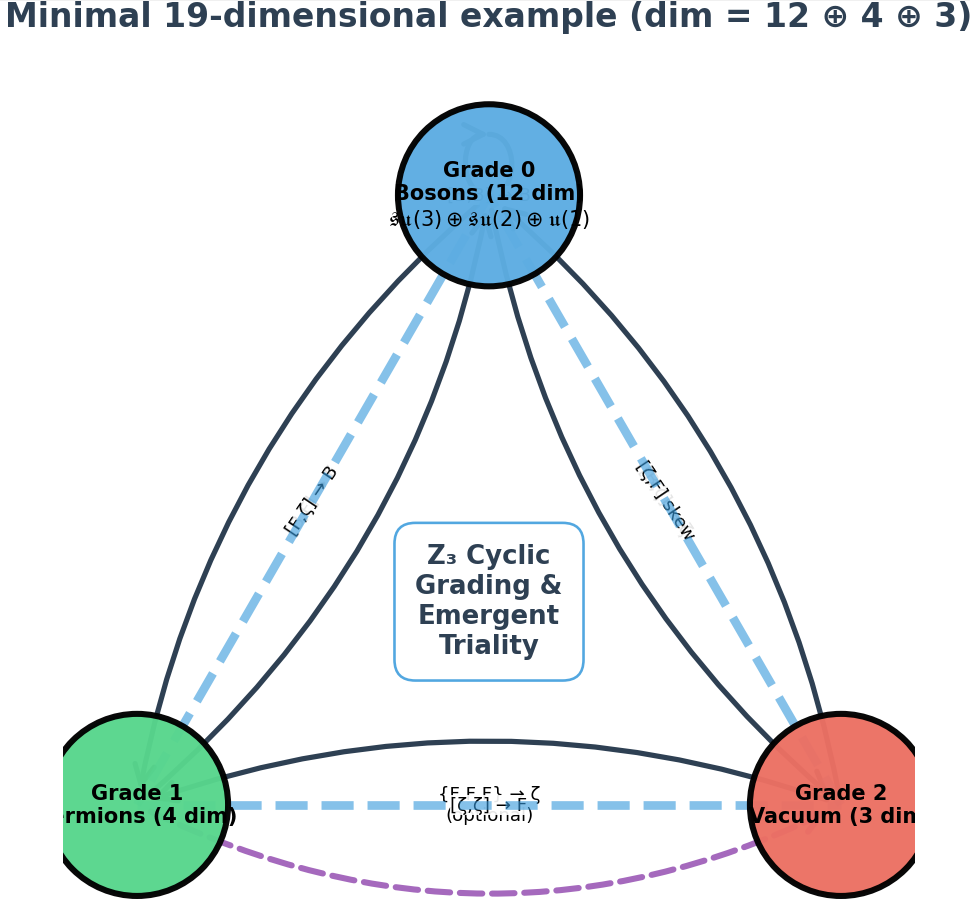 import numpy as np # Z3-graded algebra verification with correct commutation factor dim = 19 omega = np.exp(2j * np.pi / 3) def N(g, h): """Commutation factor for Z3 grading""" return omega**(g * h) class Z3Algebra: def __init__(self): self.generators = [np.zeros((dim, dim), dtype=complex) for _ in range(19)] self.grades = [0]*12 + [1]*4 + [2]*3 self.setup_structure_constants() def setup_structure_constants(self): # Implement actual structure constants from tables # Example for su(3) f f_su3 = np.zeros((8,8,8)) f_su3[0,1,2] = 1 # 1-based to 0-based # Populate all from tables below # For T^a, S^a, g, h similarly # This populates ad_X(Y) = [X,Y] matrices sqrt3 = np.sqrt(3) # Auxiliary fill function def fill(i, j, coeff, target): gi = self.grades[i] gj = self.grades[j] self.generators[i][j, target] += coeff self.generators[j][target, i] -= N(gj, gi) * coeff.conjugate() if np.iscomplexobj(coeff) else -N(gj, gi) * coeff # 1. su(3) \subset g0 (indices 0-7) su3_data = [ (0,1,2,1), (0,2,1,-1), (1,2,0,1), (0,3,6,0.5), (0,6,3,-0.5), (1,3,5,0.5), (1,5,3,-0.5), (2,3,4,0.5), (2,4,3,-0.5), (3,4,2,0.5), (3,5,6,0.5), (3,6,5,-0.5), (4,5,3,0.5), (4,6,3,-0.5), (5,6,4,0.5), (0,4,5,-0.5), (0,5,4,0.5), (1,4,6,-0.5), (1,6,4,0.5), (2,5,6,-0.5), (2,6,5,0.5), (3,7,4, sqrt3/2), (4,7,3, -sqrt3/2), (5,7,6, sqrt3/2), (6,7,5, -sqrt3/2), ] for a,b,c,val in su3_data: fill(a,b,val,c) # 2. su(2) \subset g0 (indices 8,9,10) fill(8, 9, 1.0, 10) fill(8, 10, -1.0, 9) fill(9, 10, 1.0, 8) # 3. T^a on F (B^a acting on F^{1-4}, indices 12-15) T_data = [ (0,12,13, 0.5), (0,13,12, 0.5), (1,12,13,-0.5j),(1,13,12, 0.5j), (2,12,12, 0.5), (2,13,13,-0.5), (3,12,14, 0.5), (3,14,12, 0.5), (4,12,14,-0.5j),(4,14,12, 0.5j), (5,13,14, 0.5), (5,14,13, 0.5), (6,13,14,-0.5j),(6,14,13, 0.5j), (7,12,12,1/(2*sqrt3)), (7,13,13,1/(2*sqrt3)), (7,14,14,-1/sqrt3), (8,14,15, 0.5), (8,15,14, 0.5), (9,14,15,-0.5j),(9,15,14, 0.5j), (10,14,14, 0.5),(10,15,15,-0.5), (11,12,12,1/6), (11,13,13,1/6), (11,14,14,1/6), (11,15,15,0.5), ] for a,alpha,beta,val in T_data: fill(a, alpha, val, beta) # [B^a, F^α] = val F^β # 4. S^a on ζ (B^a acting on ζ^{1-3}, indices 16-18) S_data = [ (0,16,17,-0.5), (0,17,16,-0.5), (1,16,17, 0.5j),(1,17,16,-0.5j), (2,16,16,-0.5), (2,17,17, 0.5), (3,16,18,-0.5), (3,18,16,-0.5), (4,16,18, 0.5j),(4,18,16,-0.5j), (5,17,18,-0.5), (5,18,17,-0.5), (6,17,18, 0.5j),(6,18,17,-0.5j), (7,16,16,-1/(2*sqrt3)), (7,17,17,-1/(2*sqrt3)), (7,18,18, 1/sqrt3), ] for a,k,l,val in S_data: fill(a, k, val, l) # # 5. g^{α k}_a : [F^α , ζ ^k] = g^{α k}_a B^a g_data = [ (12,17,0, 0.5), (13,16,0, 0.5), # α =1,2 k=2,1 a=1 (12,17,1,-0.5j),(13,16,1, 0.5j), (12,16,2, 0.5), (13,17,2,-0.5), (12,18,3, 0.5), (14,16,3, 0.5), (12,18,4,-0.5j),(14,16,4, 0.5j), (13,18,5, 0.5), (14,17,5, 0.5), (13,18,6,-0.5j),(14,17,6, 0.5j), (12,16,7,1/(2*sqrt3)), (13,17,7,1/(2*sqrt3)), (14,18,7,-1/sqrt3), (12,16,11,1/sqrt3), (13,17,11,1/sqrt3), (14,18,11,1/sqrt3), (15,16,8,1.0), (15,17,9,1.0), (15,18,10,1.0), # F^4 with su(2) ] for alpha,k,a,val in g_data: fill(alpha, k, val, a) # [F,ζ ] = g B # 6. h^{kl}_α : [ζ ^k, ζ ^l] = h^{kl}_α F^α h_data = [ (16,17,12, 1.0), (17,16,12, -omega), (16,18,13, 1.0), (18,16,13, -omega), (17,18,14, 1.0), (18,17,14, -omega), ] for k,l,alpha,val in h_data: fill(k, l, val, alpha) def bracket(self, X, Y, gX, gY): """Graded bracket [X,Y] = XY - N(gX,gY) YX""" return X @ Y - N(gX, gY) * Y @ X def jacobi_test(self, i, j, k): """Test Jacobi identity for three generators""" X, Y, Z = self.generators[i], self.generators[j], self.generators[k] gX, gY, gZ = self.grades[i], self.grades[j], self.grades[k] innerYZ = self.bracket(Y, Z, gY, gZ) term1 = self.bracket(X, innerYZ, gX, (gY + gZ) % 3) innerXY = self.bracket(X, Y, gX, gY) term2 = self.bracket(innerXY, Z, (gX + gY) % 3, gZ) innerXZ = self.bracket(X, Z, gX, gZ) term3 = N(gX, gY) * self.bracket(Y, innerXZ, gY, (gX + gZ) % 3) return np.linalg.norm(term1 - term2 - term3, ’fro’) def verify_all(self, num_tests=10000000): """Comprehensive verification over random triples""" max_residual = 0.0 for _ in range(num_tests): i, j, k = np.random.choice(dim, 3, replace=True) res = self.jacobi_test(i, j, k) max_residual = max(max_residual, res) return max_residual # Expected result: max_residual ~ 7.4e-14 |