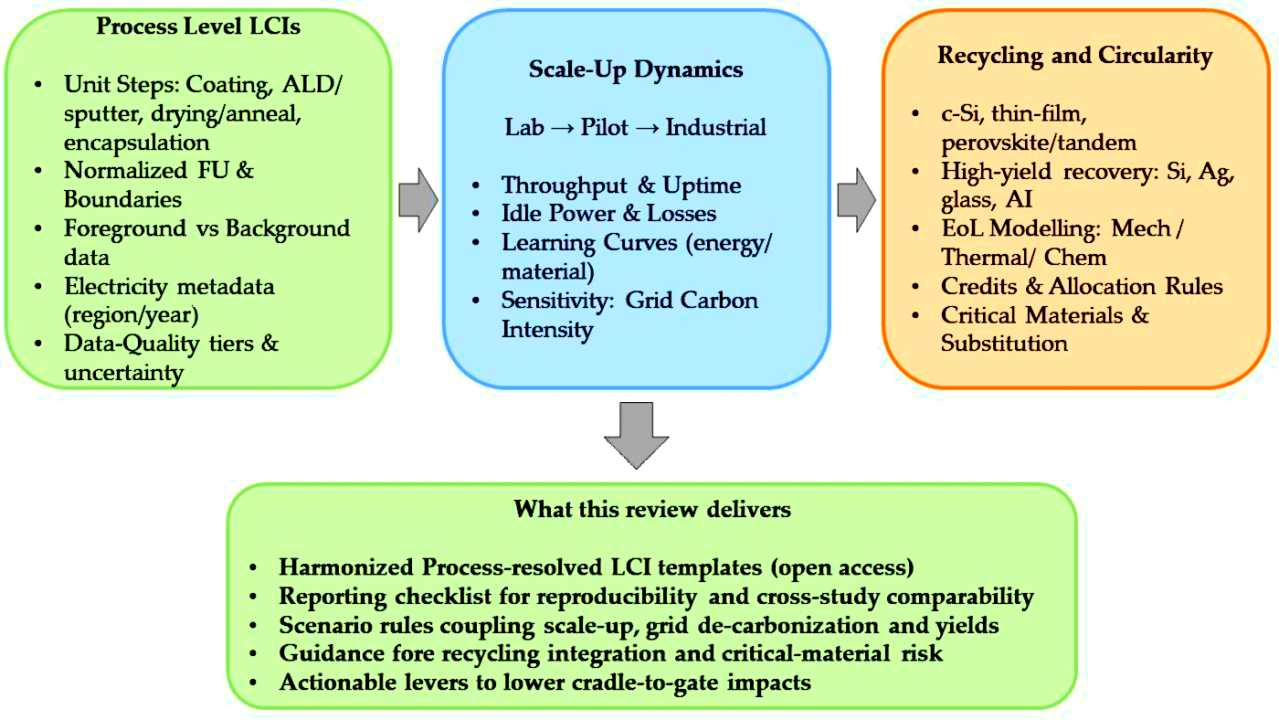 Despite this progress, no existing review systematically compiles and harmonizes process-level LCIs across the diverse manufacturing routes now emerging, from R2R coating and solution deposition to ALD, sputtering, and low-temperature encapsulation. Moreover, guidance on scaling rules, uncertainty treatment, and functional-unit normalization for such process inventories remains fragmented. Addressing these gaps is essential for consistent techno-environmental modeling and for designing the next generation of sustainable PV production lines.