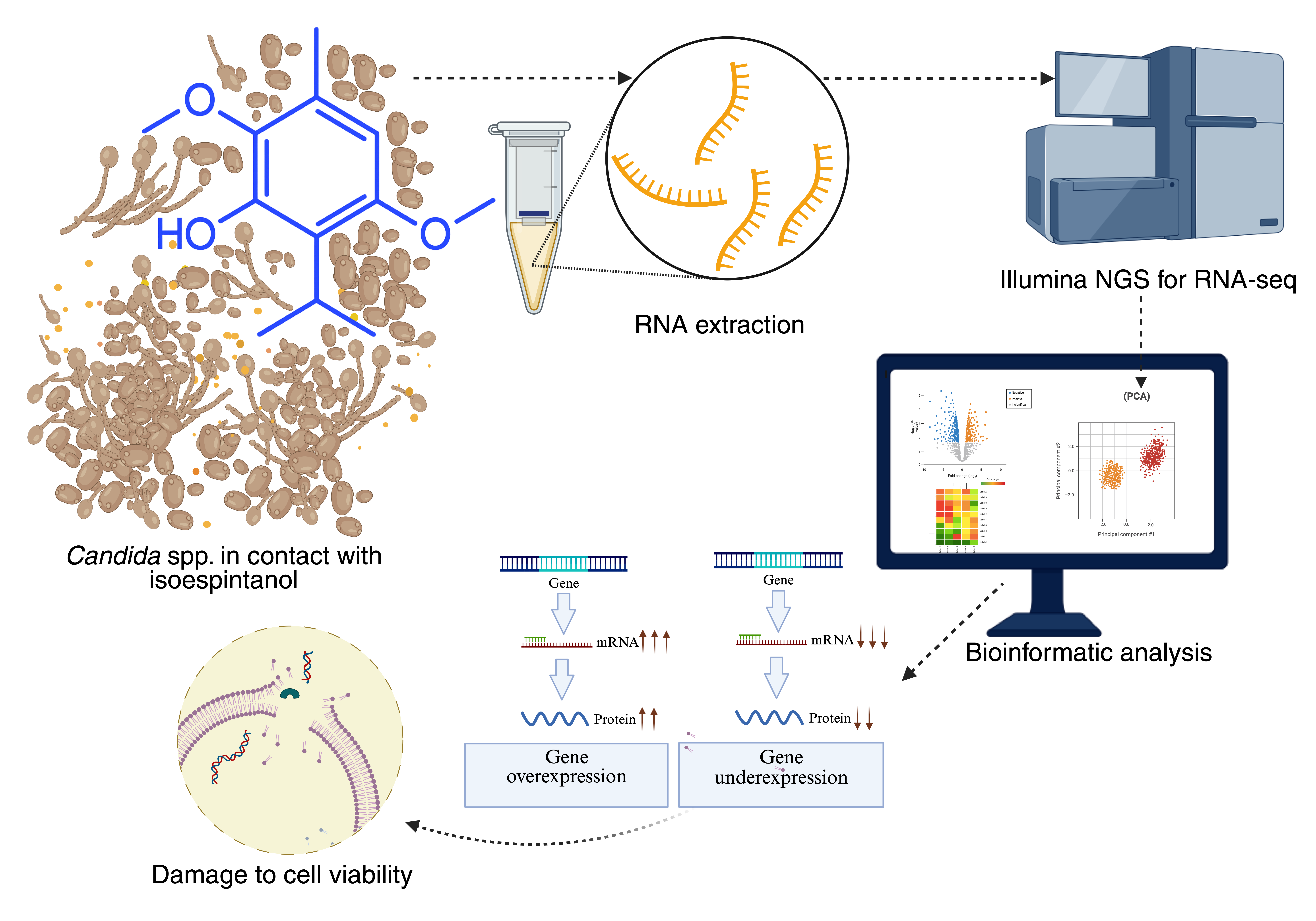 - Contreras-Martínez, O. I.; Angulo-Ortíz, A.; Santafé-Patiño, G.; Aviña-Padilla, K.; Velasco-Pareja, M. C.; Yasnot, M. F. Transcriptional Reprogramming of Candida tropicalis in Response to Isoespintanol Treatment. Journal of Fungi 2023, 9, 1199. [CrossRef]