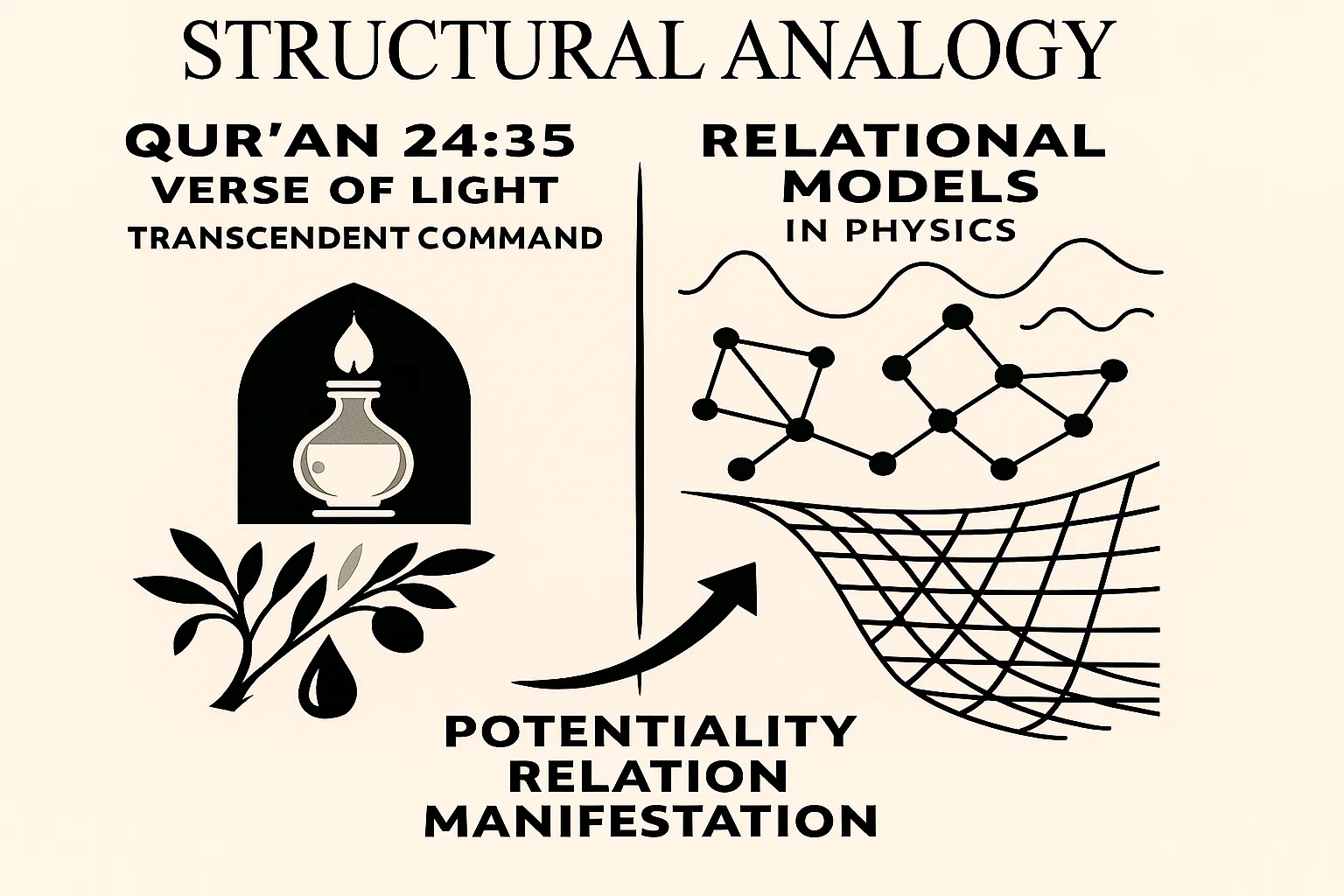 The aim of this article is not concordism, nor the extraction of scientific predictions from scripture, nor the reduction of physics to mystical allegory. Rather, it is to identify structural resonances—pattern-level correspondences—between Qur’anic symbolic ontology and contemporary scientific conceptualizations of relationality and emergence. Waḥy, ʿaql, and ṭabīʿa are treated as distinct yet intersecting epistemic axes. Through a structural–functional lens, the Verse of Light articulates a metaphysical schema—orientation, mediation, potentiality, activation, manifestation—that aligns with modern relational accounts of reality while remaining grounded in its own theological horizon.